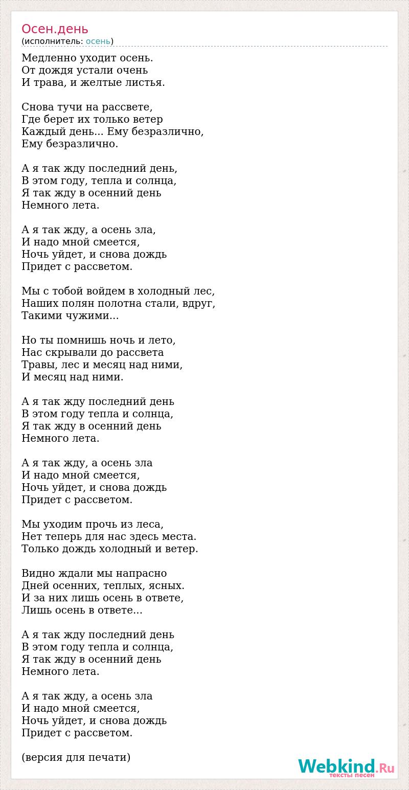 Медленно уходит осень. От дождя устали очень И трава, и желтые листья. Снова тучи на рассвете, Где берет их только ветер Каждый день... Ему безразлично, Ему безразлично. А я так жду последний день, В этом году, тепла и солнца, Я так жду в осенний день Немного лета. А я так жду, а осень зла, И надо мной смеется, Ночь уйдет, и снова дождь Придет с рассветом. Мы с тобой войдем в холодный лес, Наших полян полотна стали, вдруг, Такими чужими... Но ты помнишь ночь и лето, Нас скрывали до рассвета Травы, лес и месяц над ними, И месяц над ними. А я так жду последний день В этом году тепла и солнца, Я так жду в осенний день Немного лета. А я так жду, а осень зла И надо мной смеется, Ночь уйдет, и снова дождь Придет с рассветом. Мы уходим прочь из леса, Нет теперь для нас здесь места. Только дождь холодный и ветер. Видно ждали мы напрасно Дней осенних, теплых, ясных. И за них лишь осень в ответе, Лишь осень в ответе... А я так жду последний день В этом году тепла и солнца, Я так жду в осенний день Немного лета. А я так жду, а осень зла И надо мной смеется, Ночь уйдет, и снова дождь Придет с рассветом. (версия для печати)