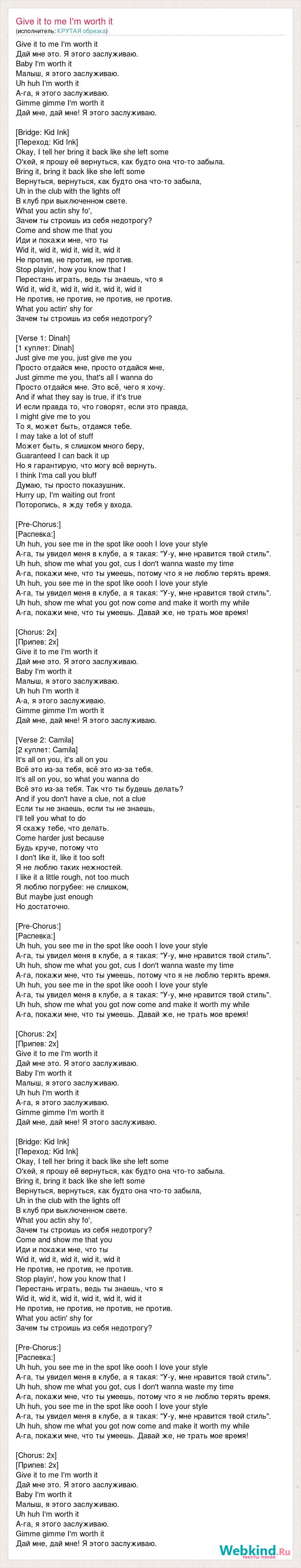 Give it to me I'm worth it Дай мне это. Я этого заслуживаю. Baby I'm worth it Малыш, я этого заслуживаю. Uh huh I'm worth it А-га, я этого заслуживаю. Gimme gimme I'm worth it Дай мне, дай мне! Я этого заслуживаю. [Bridge: Kid Ink] [Переход: Kid Ink] Okay, I tell her bring it back like she left some О'кей, я прошу её вернуться, как будто она что-то забыла. Bring it, bring it back like she left some Вернуться, вернуться, как будто она что-то забыла, Uh in the club with the lights off В клуб при выключенном свете. What you actin shy fo', Зачем ты строишь из себя недотрогу? Come and show me that you Иди и покажи мне, что ты Wid it, wid it, wid it, wid it, wid it Не против, не против, не против. Stop playin', how you know that I Перестань играть, ведь ты знаешь, что я Wid it, wid it, wid it, wid it, wid it, wid it Не против, не против, не против, не против. What you actin' shy for Зачем ты строишь из себя недотрогу? [Verse 1: Dinah] [1 куплет: Dinah] Just give me you, just give me you Просто отдайся мне, просто отдайся мне, Just gimme me you, that's all I wanna do Просто отдайся мне. Это всё, чего я хочу. And if what they say is true, if it's true И если правда то, что говорят, если это правда, I might give me to you То я, может быть, отдамся тебе. I may take a lot of stuff Может быть, я слишком много беру, Guaranteed I can back it up Но я гарантирую, что могу всё вернуть. I think I'ma call you bluff Думаю, ты просто показушник. Hurry up, I'm waiting out front Поторопись, я жду тебя у входа. [Pre-Chorus:] [Распевка:] Uh huh, you see me in the spot like oooh I love your style А-га, ты увидел меня в клубе, а я такая: "У-у, мне нравится твой стиль". Uh huh, show me what you got, cus I don't wanna waste my time А-га, покажи мне, что ты умеешь, потому что я не люблю терять время. Uh huh, you see me in the spot like oooh I love your style А-га, ты увидел меня в клубе, а я такая: "У-у, мне нравится твой стиль". Uh huh, show me what you got now come and make it worth my while А-га, покажи мне, что ты умеешь. Давай же, не трать мое время! [Chorus: 2x] [Припев: 2x] Give it to me I'm worth it Дай мне это. Я этого заслуживаю. Baby I'm worth it Малыш, я этого заслуживаю. Uh huh I'm worth it А-а, я этого заслуживаю. Gimme gimme I'm worth it Дай мне, дай мне! Я этого заслуживаю. [Verse 2: Camila] [2 куплет: Camila] It's all on you, it's all on you Всё это из-за тебя, всё это из-за тебя. It's all on you, so what you wanna do Всё это из-за тебя. Так что ты будешь делать? And if you don't have a clue, not a clue Если ты не знаешь, если ты не знаешь, I'll tell you what to do Я скажу тебе, что делать. Come harder just because Будь круче, потому что I don't like it, like it too soft Я не люблю таких нежностей. I like it a little rough, not too much Я люблю погрубее: не слишком, But maybe just enough Но достаточно. [Pre-Chorus:] [Распевка:] Uh huh, you see me in the spot like oooh I love your style А-га, ты увидел меня в клубе, а я такая: "У-у, мне нравится твой стиль". Uh huh, show me what you got, cus I don't wanna waste my time А-га, покажи мне, что ты умеешь, потому что я не люблю терять время. Uh huh, you see me in the spot like oooh I love your style А-га, ты увидел меня в клубе, а я такая: "У-у, мне нравится твой стиль". Uh huh, show me what you got now come and make it worth my while А-га, покажи мне, что ты умеешь. Давай же, не трать мое время! [Chorus: 2x] [Припев: 2x] Give it to me I'm worth it Дай мне это. Я этого заслуживаю. Baby I'm worth it Малыш, я этого заслуживаю. Uh huh I'm worth it А-га, я этого заслуживаю. Gimme gimme I'm worth it Дай мне, дай мне! Я этого заслуживаю. [Bridge: Kid Ink] [Переход: Kid Ink] Okay, I tell her bring it back like she left some О'кей, я прошу её вернуться, как будто она что-то забыла. Bring it, bring it back like she left some Вернуться, вернуться, как будто она что-то забыла, Uh in the club with the lights off В клуб при выключенном свете. What you actin shy fo', Зачем ты строишь из себя недотрогу? Come and show me that you Иди и покажи мне, что ты Wid it, wid it, wid it, wid it, wid it Не против, не против, не против. Stop playin', how you know that I Перестань играть, ведь ты знаешь, что я Wid it, wid it, wid it, wid it, wid it, wid it Не против, не против, не против, не против. What you actin' shy for Зачем ты строишь из себя не