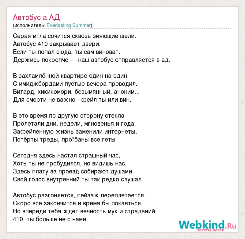 Серая мгла сочится сквозь зияющие щели. Автобус 410 закрывает двери. Если ты попал сюда, ты сам виноват. Держись покрепче — наш автобус отправляется в ад. В захламлённой квартире один на один С имиджбордами пустые вечера проводил. Битард, хикикомори, безымянный, аноним... Для смерти не важно - фейл ты или вин. В это время по другую сторону стекла Пролетали дни, недели, мгновенья и года. Зафейленную жизнь заменили интернеты. Потёрты треды, про*баны все геты Сегодня здесь настал страшный час, Хоть ты не пробудился, но видишь нас. Здесь плату за проезд собирают душами. Свой голос внутренний ты так редко слушал Автобус разгоняется, пейзаж переплетается. Скоро всё закончится и время бы покаяться, Но впереди тебя ждёт вечность мук и страданий. 410, ты больше не с нами.