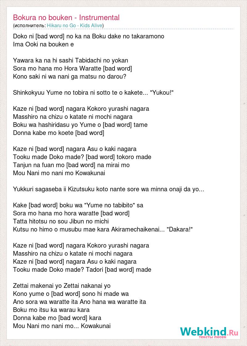Doko ni [bad word] no ka na Boku dake no takaramono Ima Ooki na bouken e Yawara ka na hi sashi Tabidachi no yokan Sora mo hana mo Hora Waratte [bad word] Kono saki ni wa nani ga matsu no darou? Shinkokyuu Yume no tobira ni sotto te o kakete... "Yukou!" Kaze ni [bad word] nagara Kokoro yurashi nagara Masshiro na chizu o katate ni mochi nagara Boku wa hashiridasu yo Yume o [bad word] tame Donna kabe mo koete [bad word] Kaze ni [bad word] nagara Asu o kaki nagara Tooku made Doko made? [bad word] tokoro made Tanjun na fuan mo [bad word] na mirai mo Mou Nani mo nani mo Kowakunai Yukkuri sagaseba ii Kizutsuku koto nante sore wa minna onaji da yo... Kake [bad word] boku wa "Yume no tabibito" sa Sora mo hana mo hora waratte [bad word] Tatta hitotsu no sou Jibun no michi Kutsu no himo o musubu mae kara Akiramechaikenai... "Dakara!" Kaze ni [bad word] nagara Kokoro yurashi nagara Masshiro na chizu o katate ni mochi nagara Kaze ni [bad word] nagara Asu o kaki nagara Tooku made Doko made? Tadori [bad word] made Zettai makenai yo Zettai nakanai yo Kono yume o [bad word] sono hi made wa Ano sora wa waratte ita Ano hana wa waratte ita Boku mo itsu ka warau kara Donna kabe mo [bad word] kara Mou Nani mo nani mo... Kowakunai