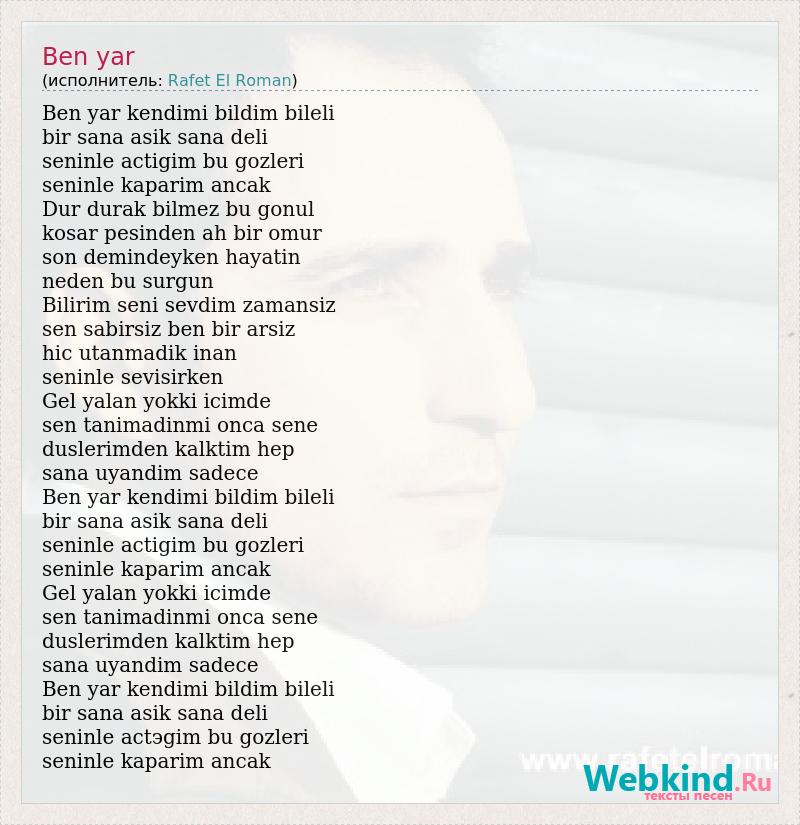 Ben yar kendimi bildim bileli bir sana asik sana deli seninle actigim bu gozleri seninle kaparim ancak Dur durak bilmez bu gonul kosar pesinden ah bir omur son demindeyken hayatin neden bu surgun Bilirim seni sevdim zamansiz sen sabirsiz ben bir arsiz hic utanmadik inan seninle sevisirken Gel yalan yokki icimde sen tanimadinmi onca sene duslerimden kalktim hep sana uyandim sadece Ben yar kendimi bildim bileli bir sana asik sana deli seninle actigim bu gozleri seninle kaparim ancak Gel yalan yokki icimde sen tanimadinmi onca sene duslerimden kalktim hep sana uyandim sadece Ben yar kendimi bildim bileli bir sana asik sana deli seninle actэgim bu gozleri seninle kaparim ancak