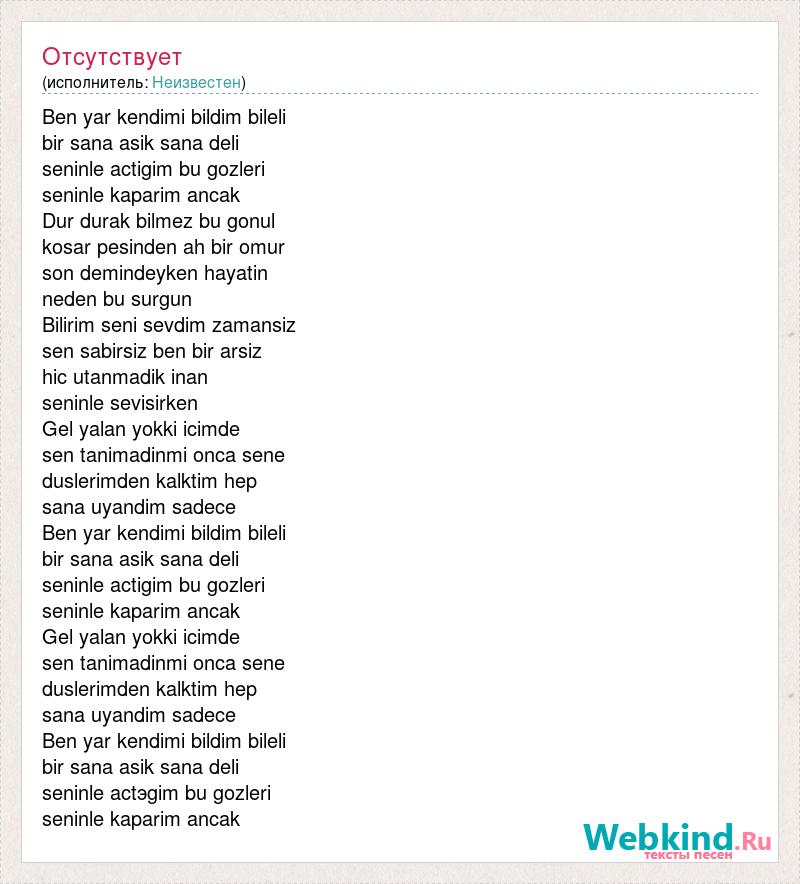 Ben yar kendimi bildim bileli bir sana asik sana deli seninle actigim bu gozleri seninle kaparim ancak Dur durak bilmez bu gonul kosar pesinden ah bir omur son demindeyken hayatin neden bu surgun Bilirim seni sevdim zamansiz sen sabirsiz ben bir arsiz hic utanmadik inan seninle sevisirken Gel yalan yokki icimde sen tanimadinmi onca sene duslerimden kalktim hep sana uyandim sadece Ben yar kendimi bildim bileli bir sana asik sana deli seninle actigim bu gozleri seninle kaparim ancak Gel yalan yokki icimde sen tanimadinmi onca sene duslerimden kalktim hep sana uyandim sadece Ben yar kendimi bildim bileli bir sana asik sana deli seninle actэgim bu gozleri seninle kaparim ancak
