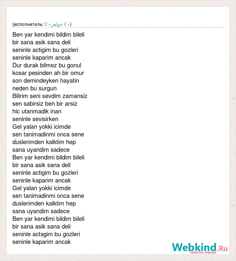 Ben yar kendimi bildim bileli bir sana asik sana deli seninle actigim bu gozleri seninle kaparim ancak Dur durak bilmez bu gonul kosar pesinden ah bir omur son demindeyken hayatin neden bu surgun Bilirim seni sevdim zamansiz sen sabirsiz ben bir arsiz hic utanmadik inan seninle sevisirken Gel yalan yokki icimde sen tanimadinmi onca sene duslerimden kalktim hep sana uyandim sadece Ben yar kendimi bildim bileli bir sana asik sana deli seninle actigim bu gozleri seninle kaparim ancak Gel yalan yokki icimde sen tanimadinmi onca sene duslerimden kalktim hep sana uyandim sadece Ben yar kendimi bildim bileli bir sana asik sana deli seninle actэgim bu gozleri seninle kaparim ancak