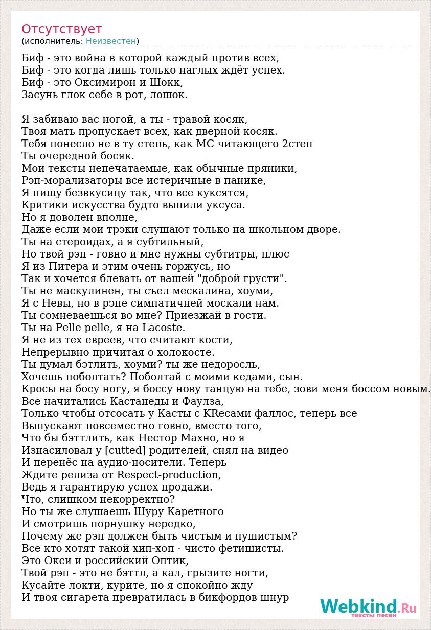 Биф - это война в которой каждый против всех, Биф - это когда лишь только наглых ждёт успех. Биф - это Оксимирон и Шокк, Засунь глок себе в рот, лошок. Я забиваю вас ногой, а ты - травой косяк, Твоя мать пропускает всех, как дверной косяк. Тебя понесло не в ту степь, как MC читающего 2степ Ты очередной босяк. Мои тексты непечатаемые, как обычные пряники, Рэп-морализаторы все истеричные в панике, Я пишу безвкусицу так, что все куксятся, Критики искусства будто выпили уксуса. Но я доволен вполне, Даже если мои трэки слушают только на школьном дворе. Ты на стероидах, а я субтильный, Но твой рэп - говно и мне нужны субтитры, плюс Я из Питера и этим очень горжусь, но Так и хочется блевать от вашей "доброй грусти". Ты не маскулинен, ты съел мескалина, хоуми, Я с Невы, но в рэпе симпатичней москали нам. Ты сомневаешься во мне? Приезжай в гости. Ты на Pelle pelle, я на Lacoste. Я не из тех евреев, что считают кости, Непрерывно причитая о холокосте. Ты думал бэтлить, хоуми? ты же недоросль, Хочешь поболтать? Поболтай с моими кедами, сын. Кросы на босу ногу, я боссу нову танцую на тебе, зови меня боссом новым. Все начитались Кастанеды и Фаулза, Только чтобы отсосать у Касты с KRecами фаллос, теперь все Выпускают повсеместно говно, вместо того, Что бы бэттлить, как Нестор Махно, но я Изнасиловал у [cutted] родителей, снял на видео И перенёс на аудио-носители. Теперь Ждите релиза от Respect-production, Ведь я гарантирую успех продажи. Что, слишком некорректно? Но ты же слушаешь Шуру Каретного И смотришь порнушку нередко, Почему же рэп должен быть чистым и пушистым? Все кто хотят такой хип-хоп - чисто фетишисты. Это Окси и российский Оптик, Твой рэп - это не бэттл, а кал, грызите ногти, Кусайте локти, курите, но я спокойно жду И твоя сигарета превратилась в бикфордов шнур