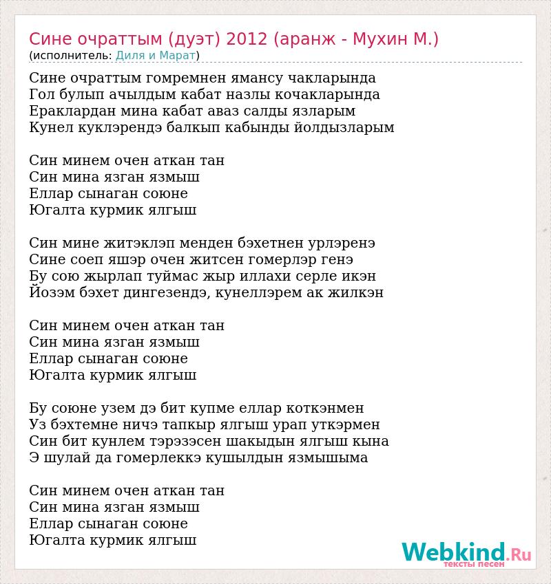 Сине очраттым гомремнен ямансу чакларында Гол булып ачылдым кабат назлы кочакларында Ераклардан мина кабат аваз салды язларым Кунел куклэрендэ балкып кабынды йолдызларым Син минем очен аткан тан Син мина язган язмыш Еллар сынаган союне Югалта курмик ялгыш Син мине житэклэп менден бэхетнен урлэренэ Сине соеп яшэр очен житсен гомерлэр генэ Бу сою жырлап туймас жыр иллахи серле икэн Йозэм бэхет дингезендэ, кунеллэрем ак жилкэн Син минем очен аткан тан Син мина язган язмыш Еллар сынаган союне Югалта курмик ялгыш Бу союне узем дэ бит купме еллар коткэнмен Уз бэхтемне ничэ тапкыр ялгыш урап уткэрмен Син бит кунлем тэрэзэсен шакыдын ялгыш кына Э шулай да гомерлеккэ кушылдын язмышыма Син минем очен аткан тан Син мина язган язмыш Еллар сынаган союне Югалта курмик ялгыш