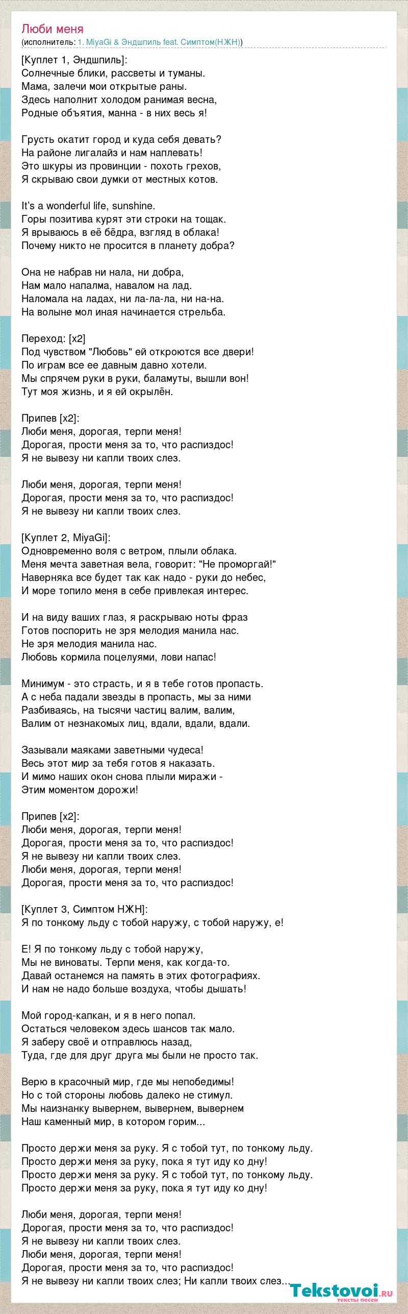 [Куплет 1, Эндшпиль]: Солнечные блики, рассветы и туманы. Мама, залечи мои открытые раны. Здесь наполнит холодом ранимая весна, Родные объятия, манна - в них весь я! Грусть окатит город и куда себя девать? На районе лигалайз и нам наплевать! Это шкуры из провинции - похоть грехов, Я скрываю свои думки от местных котов. It’s a wonderful life, sunshine. Горы позитива курят эти строки на тощак. Я врываюсь в её бёдра, взгляд в облака! Почему никто не просится в планету добра? Она не набрав ни нала, ни добра, Нам мало напалма, навалом на лад. Наломала на ладах, ни ла-ла-ла, ни на-на. На волыне мол иная начинается стрельба. Переход: [х2] Под чувством "Любовь" ей откроются все двери! По играм все ее давным давно хотели. Мы спрячем руки в руки, баламуты, вышли вон! Тут моя жизнь, и я ей окрылён. Припев [х2]: Люби меня, дорогая, терпи меня! Дорогая, прости меня за то, что распиздос! Я не вывезу ни капли твоих слез. Люби меня, дорогая, терпи меня! Дорогая, прости меня за то, что распиздос! Я не вывезу ни капли твоих слез. [Куплет 2, MiyaGi]: Одновременно воля с ветром, плыли облака. Меня мечта заветная вела, говорит: "Не проморгай!" Наверняка все будет так как надо - руки до небес, И море топило меня в себе привлекая интерес. И на виду ваших глаз, я раскрываю ноты фраз Готов поспорить не зря мелодия манила нас. Не зря мелодия манила нас. Любовь кормила поцелуями, лови напас! Минимум - это страсть, и я в тебе готов пропасть. А с неба падали звезды в пропасть, мы за ними Разбиваясь, на тысячи частиц валим, валим, Валим от незнакомых лиц, вдали, вдали, вдали. Зазывали маяками заветными чудеса! Весь этот мир за тебя готов я наказать. И мимо наших окон снова плыли миражи - Этим моментом дорожи! Припев [х2]: Люби меня, дорогая, терпи меня! Дорогая, прости меня за то, что распиздос! Я не вывезу ни капли твоих слез. Люби меня, дорогая, терпи меня! Дорогая, прости меня за то, что распиздос! [Куплет 3, Симптом НЖН]: Я по тонкому льду с тобой наружу, с тобой наружу, е! Е! Я по тонкому льду с тобой наружу, Мы не виноваты. Терпи меня, как когда-то. Давай останемся на память в этих фотографиях. И нам не надо больше воздуха, чтобы дышать! Мой город-капкан, и я в него попал. Остаться человеком здесь шансов так мало. Я заберу своё и отправлюсь назад, Туда, где для друг друга мы были не просто так. Верю в красочный мир, где мы непобедимы! Но с той стороны любовь далеко не стимул. Мы наизнанку вывернем, вывернем, вывернем Наш каменный мир, в котором горим... Просто держи меня за руку. Я с тобой тут, по тонкому льду. Просто держи меня за руку, пока я тут иду ко дну! Просто держи меня за руку. Я с тобой тут, по тонкому льду. Просто держи меня за руку, пока я тут иду ко дну! Люби меня, дорогая, терпи меня! Дорогая, прости меня за то, что распиздос! Я не вывезу ни капли твоих слез. Люби меня, дорогая, терпи меня! Дорогая, прости меня за то, что распиздос! Я не вывезу ни капли твоих слез; Ни капли твоих слез...