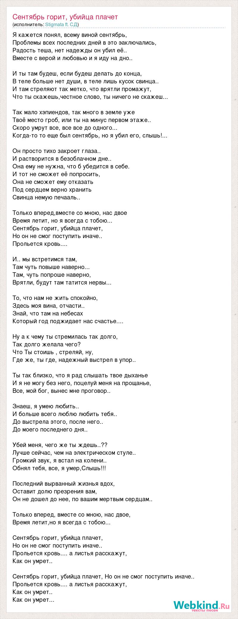 Я кажется понял, всему виной сентябрь, Проблемы всех последних дней в это эаключались, Радость теша, нет надежды он убил её.. Вместе с верой и любовью и я иду на дно.. И ты там будеш, если будеш делать до конца, В теле больше нет души, в теле лишь кусок свинца.. И там стреляют так метко, что врятли промажут, Что ты скажешь,честное слово, ты ничего не скажеш... Так мало хэпиендов, так много в земле уже Твоё место гроб, или ты на минус первом этаже.. Скоро умрут все, все все до одного... Когда-то то еще был сентябрь, но я убил его, слышь!... Он просто тихо закроет глаза.. И растворится в безоблачном дне.. Она ему не нужна, что б убедится в себе. И тот не сможет её попросить, Она не сможет ему отказать Под сердцем верно хранить Свинца немую печааль.. Только вперед,вместе со мною, нас двое Время летит, но я всегда с тобою... Сентябрь горит, убийца плачет, Но он не смог поступить иначе.. Прольется кровь.... И.. мы встретимся там, Там чуть повыше наверно... Там, чуть попроше наверно, Врятли, будут там татится нервы... То, что нам не жить спокойно, Здесь моя вина, отчасти.. Знай, что там на небесах Который год поджидает нас счастье.... Ну а к чему ты стремилась так долго, Так долго желала чего? Что Ты стоишь , стреляй, ну, Где же, ты где, надежный выстрел в упор.. Ты так близко, что я рад слышать твое дыханье И я не могу без него, поцелуй меня на прощанье, Все, мой бог, вынес мне проговор.. Знаеш, я умею любить.. И больше всего люблю любить тебя.. До выстрела этого, после него.. До моего последнего дня.. Убей меня, чего же ты ждешь..?? Лучше сейчас, чем на электрическом стуле.. Громкий звук, я встал на колени.. Обнял тебя, все, я умер,Слышь!!! Последний вырванный жизнья вдох, Оставит долю презрения вам, Он не дошел до нее, по вашим мертвым сердцам.. Только вперед, вместе со мною, нас двое, Время летит,но я всегда с тобою... Сентябрь горит, убийца плачет, Но он не смог поступить иначе.. Прольется кровь.... а листья расскажут, Как он умрет.. Сентябрь горит, убийца плачет, Но он не смог поступить иначе.. Прольется кровь.... а листья расскажут, Как он умрет.. Как он умрет...