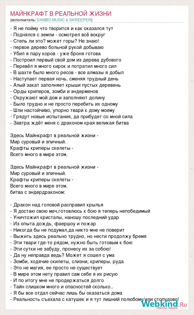 - Я не пойму что творится и как оказался тут - Поднялся с земли - осмотрел всё вокруг - Степь ли это? может горы? Не знаю! - первое дерево больной рукой добываю - Убил я пару коров - уже броня готова - Построил первый свой дом из дерева дубового - Перевёл я много кирок и потратил много сил - В шахте было много ресов - все алмазы я добыл - Наступает первая ночь, сменяя трудный день - Алый закат заполняет крыши пустых деревень - Орды криперов, зомби и эндерменов - Окружают мой дом и заполняют долину - Было трудно и не просто перебить их одному - Шли настойчиво, упорно твари к дому моему - Грядут новые испытания, да прибудет со мной сила - Завтра ждёт меня с драконом края великая битва Здесь Майнкрафт в реальной жизни - Мир суровый и эпичный. Крафты криперы скелеты - Всего много в мире этом. Здесь Майнкрафт в реальной жизни - Мир суровый и эпичный. Крафты криперы скелеты - Всего много в мире этом. битва с эндердраконом: - Дракон над головой расправил крылья - Я достаю свою меч,готовлюсь к бою я теперь непобедимый - Уничтожил кристалы, наношу последний удар - Из опыта дождь, фаершоу и пожар - Никогда бы не подумал,да никто мне не поверит - Выжить здесь реально трудно, но нести продолжу бремя - Эти твари где-то рядом, нужно быть готовым к бою - Эти сутки не забуду, пронесу их за собою! - Да ну неправда ведь? Может я сошел с ума - Зомби, ходячие скилеты, слизни, криперы, руда - Это не магия, ее просто не существует - В мире этом нету правил сам себе я их рисую - И по итогу мне не продержаться долго - Тайн слишком много и опасностей сколько.. - Я бы все отдал сейчас лишь бы оказаться дома - Реальность съехала с катушек и я тут лишний полюбому/или стопудово!