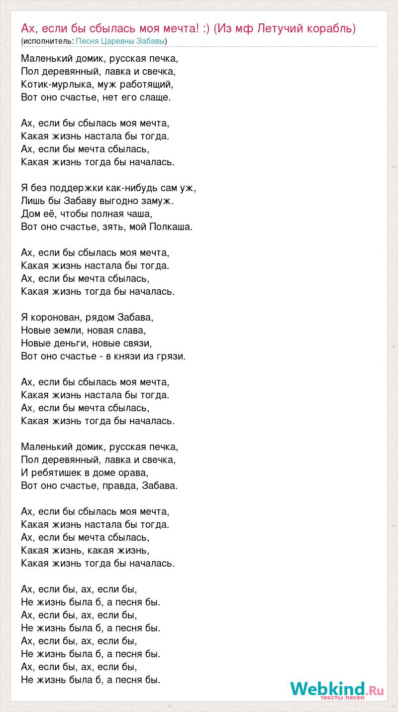Маленький домик, русская печка, Пол деревянный, лавка и свечка, Котик-мурлыка, муж работящий, Вот оно счастье, нет его слаще. Ах, если бы сбылась моя мечта, Какая жизнь настала бы тогда. Ах, если бы мечта сбылась, Какая жизнь тогда бы началась. Я без поддержки как-нибудь сам уж, Лишь бы Забаву выгодно замуж. Дом её, чтобы полная чаша, Вот оно счастье, зять, мой Полкаша. Ах, если бы сбылась моя мечта, Какая жизнь настала бы тогда. Ах, если бы мечта сбылась, Какая жизнь тогда бы началась. Я коронован, рядом Забава, Новые земли, новая слава, Новые деньги, новые связи, Вот оно счастье - в князи из грязи. Ах, если бы сбылась моя мечта, Какая жизнь настала бы тогда. Ах, если бы мечта сбылась, Какая жизнь тогда бы началась. Маленький домик, русская печка, Пол деревянный, лавка и свечка, И ребятишек в доме орава, Вот оно счастье, правда, Забава. Ах, если бы сбылась моя мечта, Какая жизнь настала бы тогда. Ах, если бы мечта сбылась, Какая жизнь, какая жизнь, Какая жизнь тогда бы началась. Ах, если бы, ах, если бы, Не жизнь была б, а песня бы. Ах, если бы, ах, если бы, Не жизнь была б, а песня бы. Ах, если бы, ах, если бы, Не жизнь была б, а песня бы. Ах, если бы, ах, если бы, Не жизнь была б, а песня бы.