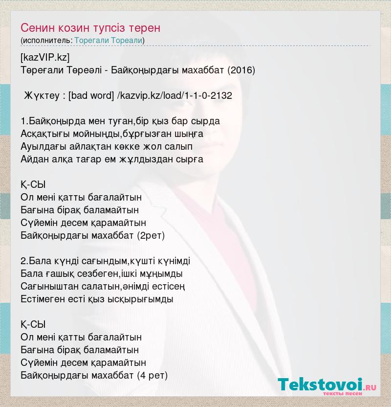 [kazVIP.kz] Төреғали Төреәлі - Байқоңырдағы махаббат (2016) 💾Жүктеу : [bad word] /kazvip.kz/load/1-1-0-2132 1.Байқоңырда мен туған,бір қыз бар сырда Асқақтығы мойныңды,бұрғызған шыңға Ауылдағы айлақтан көкке жол салып Айдан алқа тағар ем жұлдыздан сырға Қ-СЫ Ол мені қатты бағалайтын Бағына бірақ баламайтын Сүйемін десем қарамайтын Байқоңырдағы махаббат (2рет) 2.Бала күнді сағындым,күшті күнімді Бала ғашық сезбеген,ішкі мұңымды Сағыныштан салатын,әнімді естісең Естімеген есті қыз ысқырығымды Қ-СЫ Ол мені қатты бағалайтын Бағына бірақ баламайтын Сүйемін десем қарамайтын Байқоңырдағы махаббат (4 рет)