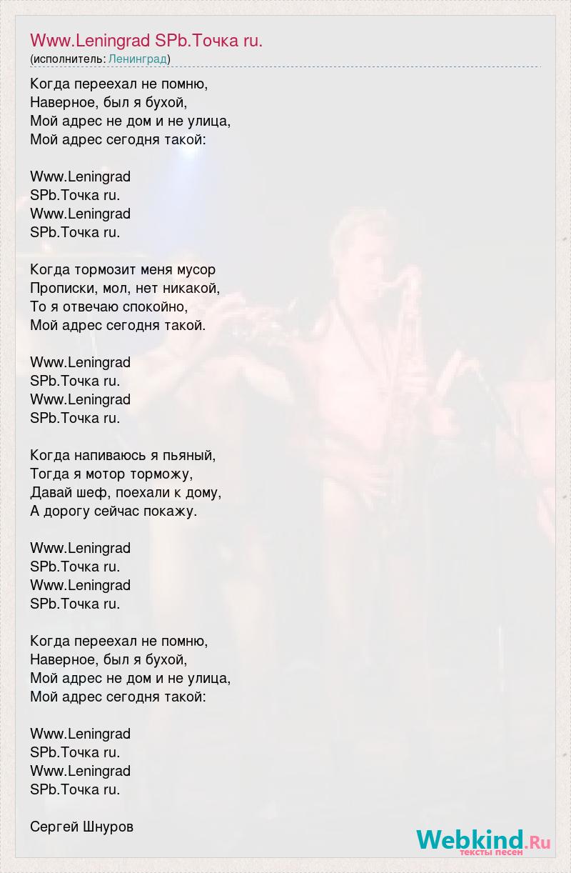 Когда переехал не помню, Наверное, был я бухой, Мой адрес не дом и не улица, Мой адрес сегодня такой: Www.Leningrad SPb.Точка ru. Www.Leningrad SPb.Точка ru. Когда тормозит меня мусор Прописки, мол, нет никакой, То я отвечаю спокойно, Мой адрес сегодня такой. Www.Leningrad SPb.Точка ru. Www.Leningrad SPb.Точка ru. Когда напиваюсь я пьяный, Тогда я мотор торможу, Давай шеф, поехали к дому, А дорогу сейчас покажу. Www.Leningrad SPb.Точка ru. Www.Leningrad SPb.Точка ru. Когда переехал не помню, Наверное, был я бухой, Мой адрес не дом и не улица, Мой адрес сегодня такой: Www.Leningrad SPb.Точка ru. Www.Leningrad SPb.Точка ru. Сергей Шнуров