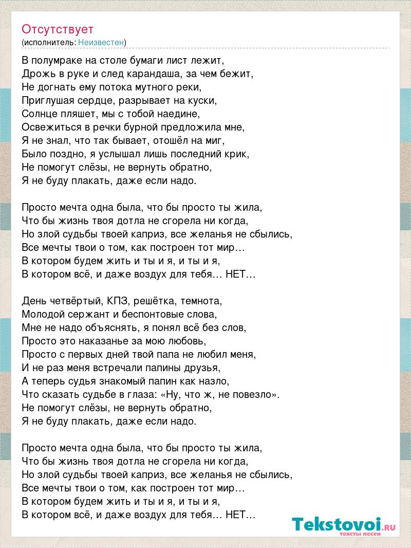 В полумраке на столе бумаги лист лежит, Дрожь в руке и след карандаша, за чем бежит, Не догнать ему потока мутного реки, Приглушая сердце, разрывает на куски, Солнце пляшет, мы с тобой наедине, Освежиться в речки бурной предложила мне, Я не знал, что так бывает, отошёл на миг, Было поздно, я услышал лишь последний крик, Не помогут слёзы, не вернуть обратно, Я не буду плакать, даже если надо. Просто мечта одна была, что бы просто ты жила, Что бы жизнь твоя дотла не сгорела ни когда, Но злой судьбы твоей каприз, все желанья не сбылись, Все мечты твои о том, как построен тот мир… В котором будем жить и ты и я, и ты и я, В котором всё, и даже воздух для тебя… НЕТ… День четвёртый, КПЗ, решётка, темнота, Молодой сержант и беспонтовые слова, Мне не надо объяснять, я понял всё без слов, Просто это наказанье за мою любовь, Просто с первых дней твой папа не любил меня, И не раз меня встречали папины друзья, А теперь судья знакомый папин как назло, Что сказать судьбе в глаза: «Ну, что ж, не повезло». Не помогут слёзы, не вернуть обратно, Я не буду плакать, даже если надо. Просто мечта одна была, что бы просто ты жила, Что бы жизнь твоя дотла не сгорела ни когда, Но злой судьбы твоей каприз, все желанья не сбылись, Все мечты твои о том, как построен тот мир… В котором будем жить и ты и я, и ты и я, В котором всё, и даже воздух для тебя… НЕТ…