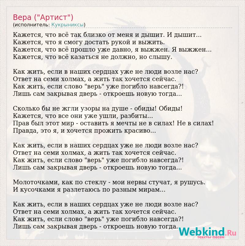 Кажется, что всё так близко от меня и дышит. И дышит... Кажется, что я смогу достать рукой и выжить. Кажется, что всё прошло уже давно, я выжжен. Я выжжен... Кажется, что всё казаться не должно, но слышу. Как жить, если в наших сердцах уже не люди возле нас? Ответ на семи холмах, а жить так хочется сейчас. Как жить, если слово "верь" уже погибло навсегда?! Лишь сам закрывая дверь - откроешь новую тогда... Сколько бы не жгли узоры на душе - обиды! Обиды! Кажется, что все они уже ушли, разбиты... Прав был этот мир - оставить я мечты не в силах! Не в силах! Правда, это я, и хочется прожить красиво... Как жить, если в наших сердцах уже не люди возле нас? Ответ на семи холмах, а жить так хочется сейчас. Как жить, если слово "верь" уже погибло навсегда?! Лишь сам закрывая дверь - откроешь новую тогда... Молоточками, как по стеклу - мои нервы стучат, я рушусь. И кусочками я разлетаюсь по разным мирам... Как жить, если в наших сердцах уже не люди возле нас? Ответ на семи холмах, а жить так хочется сейчас. Как жить, если слово "верь" уже погибло навсегда?! Лишь сам закрывая дверь - откроешь новую тогда.