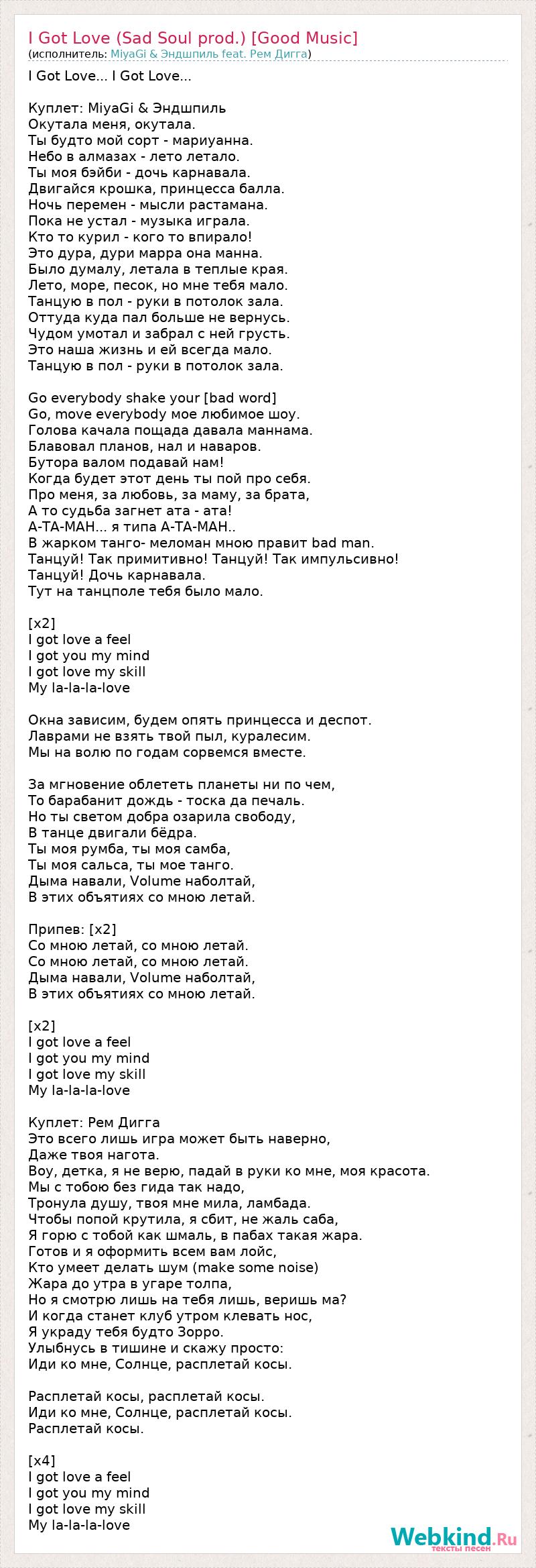 I Got Love... I Got Love... Куплет: MiyaGi & Эндшпиль Окутала меня, окутала. Ты будто мой сорт - мариуанна. Небо в алмазах - лето летало. Ты моя бэйби - дочь карнавала. Двигайся крошка, принцесса балла. Ночь перемен - мысли растамана. Пока не устал - музыка играла. Кто то курил - кого то впирало! Это дура, дури марра она манна. Было думалу, летала в теплые края. Лето, море, песок, но мне тебя мало. Танцую в пол - руки в потолок зала. Оттуда куда пал больше не вернусь. Чудом умотал и забрал с ней грусть. Это наша жизнь и ей всегда мало. Танцую в пол - руки в потолок зала. Go everybody shake your [bad word] Go, move everybody мое любимое шоу. Голова качала пощада давала маннама. Блавовал планов, нал и наваров. Бутора валом подавай нам! Когда будет этот день ты пой про себя. Про меня, за любовь, за маму, за брата, А то судьба загнет ата - ата! А-ТА-МАН... я типа А-ТА-МАН.. В жарком танго- меломан мною правит bad man. Танцуй! Так примитивно! Танцуй! Так импульсивно! Танцуй! Дочь карнавала. Тут на танцполе тебя было мало. [x2] I got love a feel I got you my mind I got love my skill My la-la-la-love Окна зависим, будем опять принцесса и деспот. Лаврами не взять твой пыл, куралесим. Мы на волю по годам сорвемся вместе. За мгновение облететь планеты ни по чем, То барабанит дождь - тоска да печаль. Но ты светом добра озарила свободу, В танце двигали бёдра. Ты моя румба, ты моя самба, Ты моя сальса, ты мое танго. Дыма навали, Volume наболтай, В этих объятиях со мною летай. Припев: [х2] Со мною летай, со мною летай. Со мною летай, со мною летай. Дыма навали, Volume наболтай, В этих объятиях со мною летай. [х2] I got love a feel I got you my mind I got love my skill My la-la-la-love Куплет: Рем Дигга Это всего лишь игра может быть наверно, Даже твоя нагота. Воу, детка, я не верю, падай в руки ко мне, моя красота. Мы с тобою без гида так надо, Тронула душу, твоя мне мила, ламбада. Чтобы попой крутила, я сбит, не жаль саба, Я горю с тобой как шмаль, в пабах такая жара. Готов и я оформить всем вам лойс, Кто умеет делать шум (make some noise) Жара до утра в угаре толпа, Но я смотрю лишь на тебя лишь, веришь ма? И когда станет клуб утром клевать нос, Я украду тебя будто Зорро. Улыбнусь в тишине и скажу просто: Иди ко мне, Солнце, расплетай косы. Расплетай косы, расплетай косы. Иди ко мне, Солнце, расплетай косы. Расплетай косы. [x4] I got love a feel I got you my mind I got love my skill My la-la-la-love