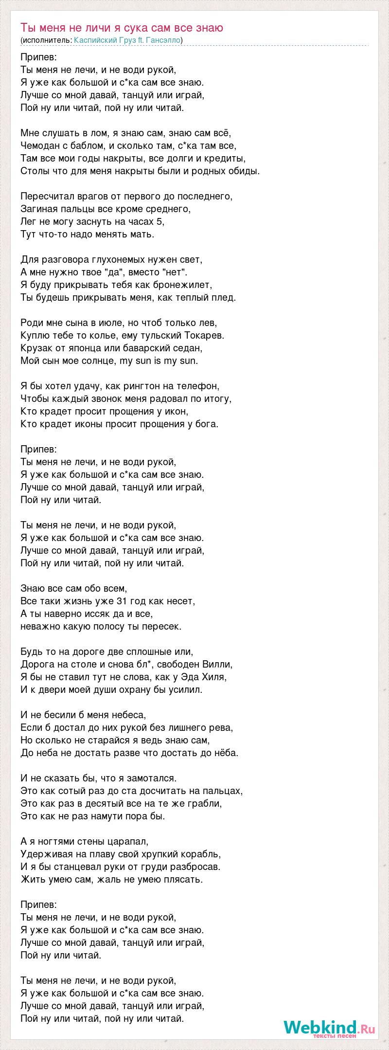 Припев: Ты меня не лечи, и не води рукой, Я уже как большой и с*ка сам все знаю. Лучше со мной давай, танцуй или играй, Пой ну или читай, пой ну или читай. Мне слушать в лом, я знаю сам, знаю сам всё, Чемодан с баблом, и сколько там, с*ка там все, Там все мои годы накрыты, все долги и кредиты, Столы что для меня накрыты были и родных обиды. Пересчитал врагов от первого до последнего, Загиная пальцы все кроме среднего, Лег не могу заснуть на часах 5, Тут что-то надо менять мать. Для разговора глухонемых нужен свет, А мне нужно твое "да", вместо "нет". Я буду прикрывать тебя как бронежилет, Ты будешь прикрывать меня, как теплый плед. Роди мне сына в июле, но чтоб только лев, Куплю тебе то колье, ему тульский Токарев. Крузак от японца или баварский седан, Мой сын мое солнце, my sun is my sun. Я бы хотел удачу, как рингтон на телефон, Чтобы каждый звонок меня радовал по итогу, Кто крадет просит прощения у икон, Кто крадет иконы просит прощения у бога. Припев: Ты меня не лечи, и не води рукой, Я уже как большой и с*ка сам все знаю. Лучше со мной давай, танцуй или играй, Пой ну или читай. Ты меня не лечи, и не води рукой, Я уже как большой и с*ка сам все знаю. Лучше со мной давай, танцуй или играй, Пой ну или читай, пой ну или читай. Знаю все сам обо всем, Все таки жизнь уже 31 год как несет, А ты наверно иссяк да и все, неважно какую полосу ты пересек. Будь то на дороге две сплошные или, Дорога на столе и снова бл*, свободен Вилли, Я бы не ставил тут не слова, как у Эда Хиля, И к двери моей души охрану бы усилил. И не бесили б меня небеса, Если б достал до них рукой без лишнего рева, Но сколько не старайся я ведь знаю сам, До неба не достать разве что достать до нёба. И не сказать бы, что я замотался. Это как сотый раз до ста досчитать на пальцах, Это как раз в десятый все на те же грабли, Это как не раз намути пора бы. А я ногтями стены царапал, Удерживая на плаву свой хрупкий корабль, И я бы станцевал руки от груди разбросав. Жить умею сам, жаль не умею плясать. Припев: Ты меня не лечи, и не води рукой, Я уже как большой и с*ка сам все знаю. Лучше со мной давай, танцуй или играй, Пой ну или читай. Ты меня не лечи, и не води рукой, Я уже как большой и с*ка сам все знаю. Лучше со мной давай, танцуй или играй, Пой ну или читай, пой ну или читай.