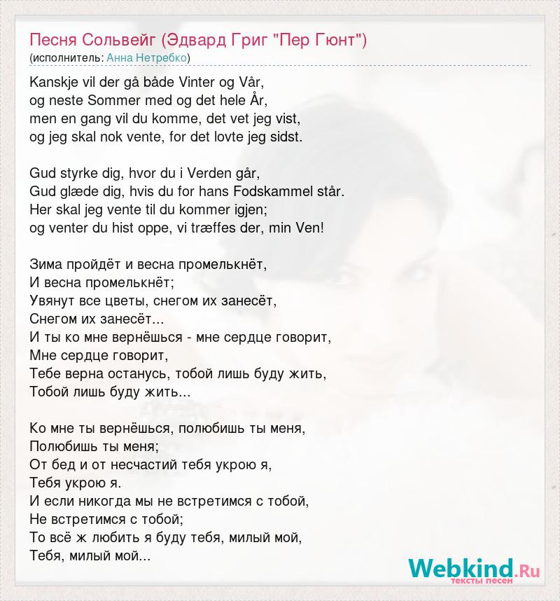 Kanskje vil der gå både Vinter og Vår, og neste Sommer med og det hele År, men en gang vil du komme, det vet jeg vist, og jeg skal nok vente, for det lovte jeg sidst. Gud styrke dig, hvor du i Verden går, Gud glæde dig, hvis du for hans Fodskammel står. Her skal jeg vente til du kommer igjen; og venter du hist oppe, vi træffes der, min Ven! Зима пройдёт и весна промелькнёт, И весна промелькнёт; Увянут все цветы, снегом их занесёт, Снегом их занесёт... И ты ко мне вернёшься - мне сердце говорит, Мне сердце говорит, Тебе верна останусь, тобой лишь буду жить, Тобой лишь буду жить... Ко мне ты вернёшься, полюбишь ты меня, Полюбишь ты меня; От бед и от несчастий тебя укрою я, Тебя укрою я. И если никогда мы не встретимся с тобой, Не встретимся с тобой; То всё ж любить я буду тебя, милый мой, Тебя, милый мой...