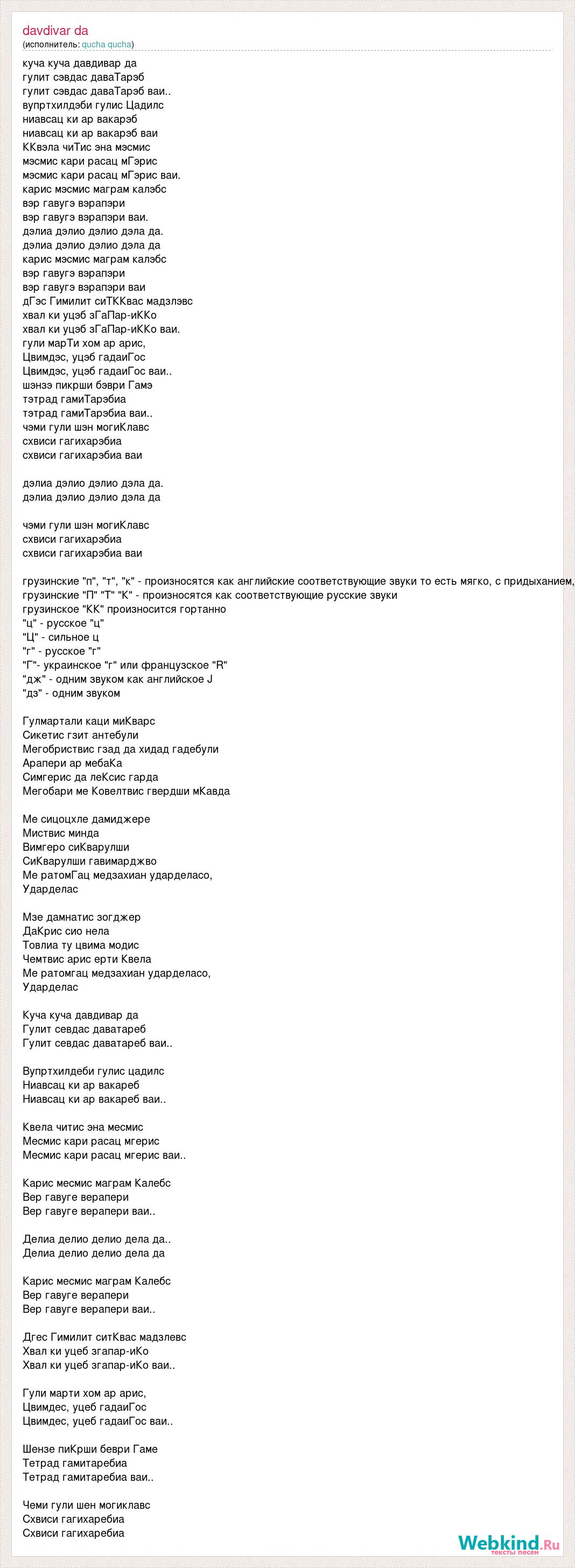 куча куча давдивар да гулит сэвдас даваТарэб гулит сэвдас даваТарэб ваи.. вупртхилдэби гулис Цадилс ниавсац ки ар вакарэб ниавсац ки ар вакарэб ваи ККвэла чиТис эна мэсмис мэсмис кари расац мГэрис мэсмис кари расац мГэрис ваи. карис мэсмис маграм калэбс вэр гавугэ вэрапэри вэр гавугэ вэрапэри ваи. дэлиа дэлио дэлио дэла да. дэлиа дэлио дэлио дэла да карис мэсмис маграм калэбс вэр гавугэ вэрапэри вэр гавугэ вэрапэри ваи дГэс Гимилит сиТККвас мадзлэвс хвал ки уцэб зГаПар-иККо хвал ки уцэб зГаПар-иККо ваи. гули марТи хом ар арис, Цвимдэс, уцэб гадаиГос Цвимдэс, уцэб гадаиГос ваи.. шэнзэ пикрши бэври Гамэ тэтрад гамиТарэбиа тэтрад гамиТарэбиа ваи.. чэми гули шэн могиКлавс схвиси гагихарэбиа схвиси гагихарэбиа ваи дэлиа дэлио дэлио дэла да. дэлиа дэлио дэлио дэла да чэми гули шэн могиКлавс схвиси гагихарэбиа схвиси гагихарэбиа ваи грузинские "п", "т", "к" - произносятся как английские соответствующие звуки то есть мягко, с придыханием, грузинские "П" "Т" "К" - произносятся как соответствующие русские звуки грузинское "КК" произносится гортанно "ц" - русское "ц" "Ц" - сильное ц "г" - русское "г" "Г"- украинское "г" или французское "R" "дж" - одним звуком как английское J "дз" - одним звуком Гулмартали каци миКварс Сикетис гзит антебули Мегобриствис гзад да хидад гадебули Арапери ар мебаКа Симгерис да леКсис гарда Мегобари ме Ковелтвис гвердши мКавда Ме сицоцхле дамиджере Миствис минда Вимгеро сиКварулши СиКварулши гавимарджво Ме ратомГац медзахиан ударделасо, Ударделас Мзе дамнатис зогджер ДаКрис сио нела Товлиа ту цвима модис Чемтвис арис ерти Квела Ме ратомгац медзахиан ударделасо, Ударделас Куча куча давдивар да Гулит севдас даватареб Гулит севдас даватареб ваи.. Вупртхилдеби гулис цадилс Ниавсац ки ар вакареб Ниавсац ки ар вакареб ваи.. Квела читис эна месмис Месмис кари расац мгерис Месмис кари расац мгерис ваи.. Карис месмис маграм Калебс Вер гавуге верапери Вер гавуге верапери ваи.. Делиа делио делио дела да.. Делиа делио делио дела да Карис месмис маграм Калебс Вер гавуге верапери Вер гавуге верапери ваи.. Дгес Гимилит ситКвас мадзлевс Хвал ки уцеб згапар-иКо Хвал ки уцеб згапар-иКо ваи.. Гули марти хом ар арис, Цвимдес, уцеб гадаиГос Цвимдес, уцеб гадаиГос ваи.. Шензе пиКрши беври Гаме Тетрад гамитаребиа Тетрад гамитаребиа ваи.. Чеми гули шен могиклавс Схвиси гагихаребиа Схвиси гагихаребиа