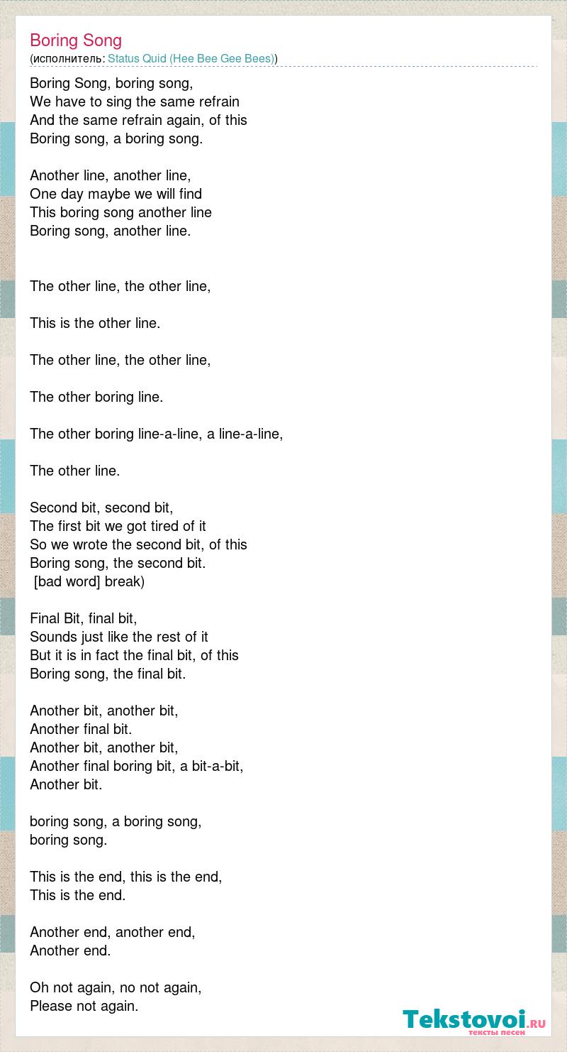 Boring Song, boring song, We have to sing the same refrain And the same refrain again, of this Boring song, a boring song. Another line, another line, One day maybe we will find This boring song another line Boring song, another line. The other line, the other line, This is the other line. The other line, the other line, The other boring line. The other boring line-a-line, a line-a-line, The other line. Second bit, second bit, The first bit we got tired of it So we wrote the second bit, of this Boring song, the second bit. (Instrumental break) Final Bit, final bit, Sounds just like the rest of it But it is in fact the final bit, of this Boring song, the final bit. Another bit, another bit, Another final bit. Another bit, another bit, Another final boring bit, a bit-a-bit, Another bit. boring song, a boring song, boring song. This is the end, this is the end, This is the end. Another end, another end, Another end. Oh not again, no not again, Please not again.