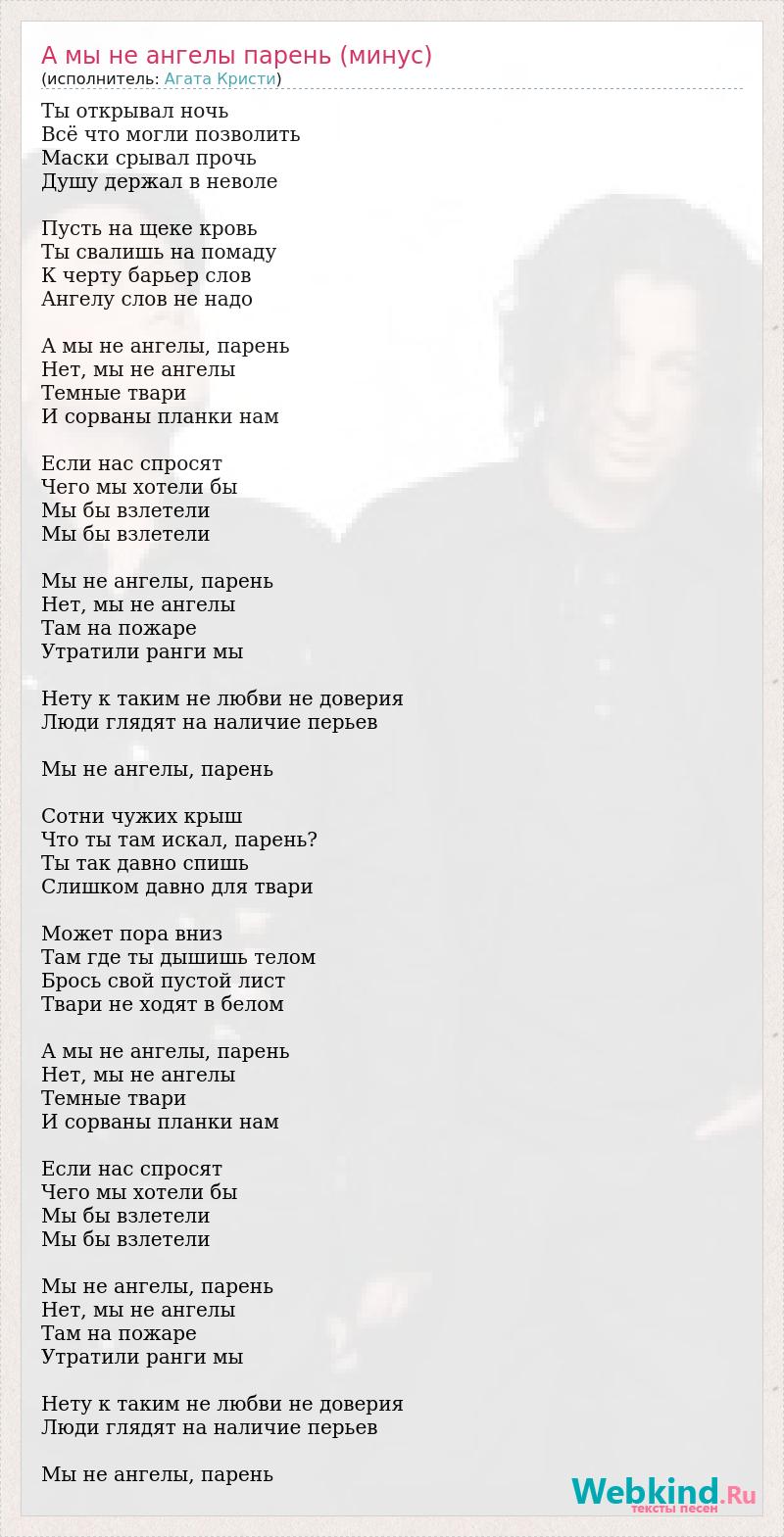 Ты открывал ночь Всё что могли позволить Маски срывал прочь Душу держал в неволе Пусть на щеке кровь Ты свалишь на помаду К черту барьер слов Ангелу слов не надо А мы не ангелы, парень Нет, мы не ангелы Темные твари И сорваны планки нам Если нас спросят Чего мы хотели бы Мы бы взлетели Мы бы взлетели Мы не ангелы, парень Нет, мы не ангелы Там на пожаре Утратили ранги мы Нету к таким не любви не доверия Люди глядят на наличие перьев Мы не ангелы, парень Сотни чужих крыш Что ты там искал, парень? Ты так давно спишь Слишком давно для твари Может пора вниз Там где ты дышишь телом Брось свой пустой лист Твари не ходят в белом А мы не ангелы, парень Нет, мы не ангелы Темные твари И сорваны планки нам Если нас спросят Чего мы хотели бы Мы бы взлетели Мы бы взлетели Мы не ангелы, парень Нет, мы не ангелы Там на пожаре Утратили ранги мы Нету к таким не любви не доверия Люди глядят на наличие перьев Мы не ангелы, парень