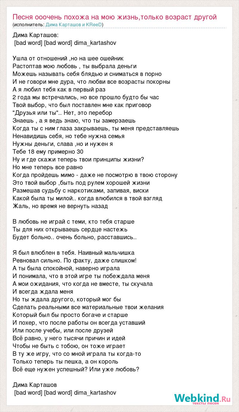 Дима Карташов: [bad word] [bad word] dima_kartashov Ушла от отношений ,но на шее ошейник Растоптав мою любовь , ты выбрала деньги Можешь называть себя блядью и сниматься в порно И не говори мне дура, что любви все возрасты покорны А я любил тебя как в первый раз 2 года мы встречались, но все прошло будто бы час Твой выбор, что был поставлен мне как приговор "Друзья или ты".. Нет, это перебор Знаешь , а я ведь знаю, что ты замерзаешь Когда ты с ним глаза закрываешь, ты меня представляешь Ненавидишь себя, но тебе нужна семья Нужны деньги, слава ,но и нужен я Тебе 18 ему примерно 30 Ну и где скажи теперь твои принципы жизни? Но мне теперь все равно Когда пройдешь мимо - даже не посмотрю в твою сторону Это твой выбор ,быть под рулем хорошей жизни Размешав судьбу с наркотиками, запивая, виски Какой была ты милой.. когда влюбился в твой взгляд Жаль, но время не вернуть назад В любовь не играй с теми, кто тебя старше Ты для них открываешь сердце настежь Будет больно.. очень больно, расставшись.. Я был влюблен в тебя. Наивный мальчишка Ревновал сильно. По факту, даже слишком! А ты была спокойной, наверно играла И понимала, что в этой игре ты побеждала меня А мои ожидания, что когда не вместе, ты скучала И всегда ждала меня Но ты ждала другого, который мог бы Сделать реальными все материальные твои желания Который был бы просто богаче и старше И похер, что после работы он всегда уставший Или после учебы, или после друзей Всё равно, у него тысячи причин и идей Чтобы не быть с тобою, он тоже играет В ту же игру, что со мной играла ты когда-то Только теперь ты пешка, а он король Всё еще нужен успешный? Или уже любовь? Дима Карташов [bad word] [bad word] dima_kartashov