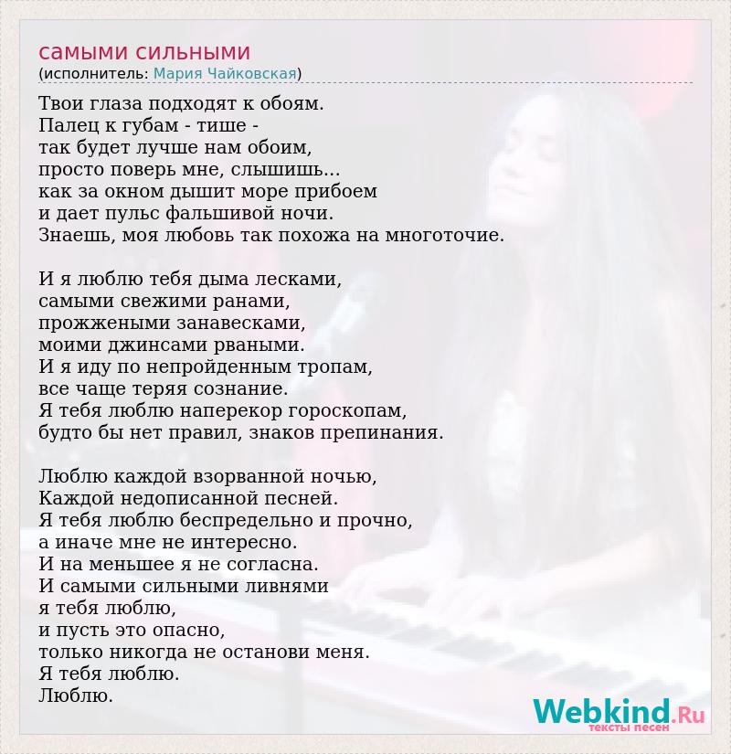 Твои глаза подходят к обоям. Палец к губам - тише - так будет лучше нам обоим, просто поверь мне, слышишь... как за окном дышит море прибоем и дает пульс фальшивой ночи. Знаешь, моя любовь так похожа на многоточие. И я люблю тебя дыма лесками, самыми свежими ранами, прожжеными занавесками, моими джинсами рваными. И я иду по непройденным тропам, все чаще теряя сознание. Я тебя люблю наперекор гороскопам, будто бы нет правил, знаков препинания. Люблю каждой взорванной ночью, Каждой недописанной песней. Я тебя люблю беспредельно и прочно, а иначе мне не интересно. И на меньшее я не согласна. И самыми сильными ливнями я тебя люблю, и пусть это опасно, только никогда не останови меня. Я тебя люблю. Люблю.