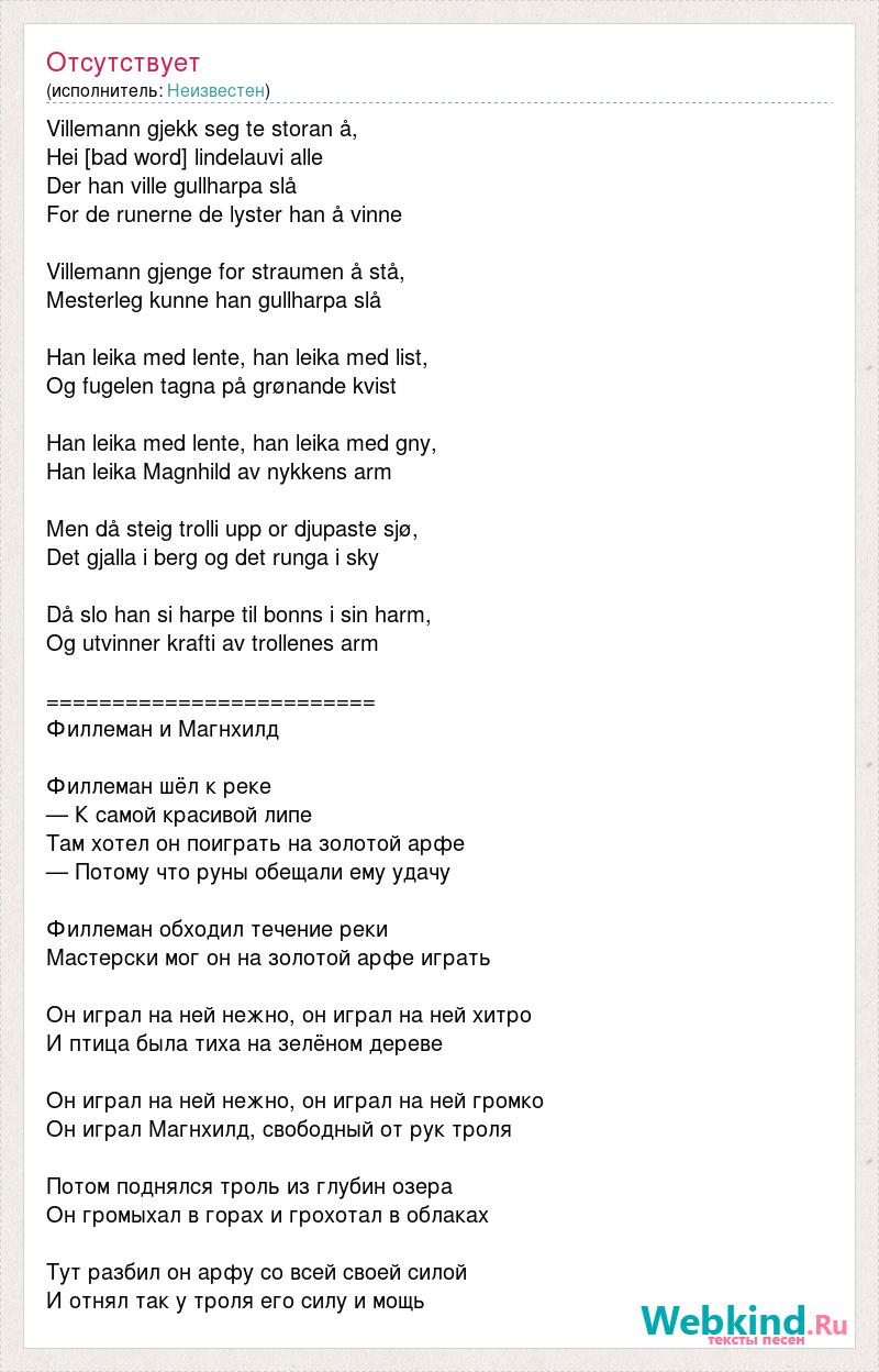 Villemann gjekk seg te storan å, Hei [bad word] lindelauvi alle Der han ville gullharpa slå For de runerne de lyster han å vinne Villemann gjenge for straumen å stå, Mesterleg kunne han gullharpa slå Han leika med lente, han leika med list, Og fugelen tagna på grønande kvist Han leika med lente, han leika med gny, Han leika Magnhild av nykkens arm Men då steig trolli upp or djupaste sjø, Det gjalla i berg og det runga i sky Då slo han si harpe til bonns i sin harm, Og utvinner krafti av trollenes arm ========================= Филлеман и Магнхилд Филлеман шёл к реке — К самой красивой липе Там хотел он поиграть на золотой арфе — Потому что руны обещали ему удачу Филлеман обходил течение реки Мастерски мог он на золотой арфе играть Он играл на ней нежно, он играл на ней хитро И птица была тиха на зелёном дереве Он играл на ней нежно, он играл на ней громко Он играл Магнхилд, свободный от рук троля Потом поднялся троль из глубин озера Он громыхал в горах и грохотал в облаках Тут разбил он арфу со всей своей силой И отнял так у троля его силу и мощь