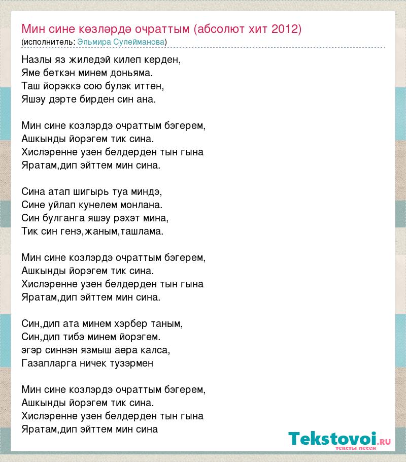 Назлы яз жиледэй килеп керден, Яме беткэн минем доньяма. Таш йорэккэ сою булэк иттен, Яшэу дэрте бирден син ана. Мин сине козлэрдэ очраттым бэгерем, Ашкынды йорэгем тик сина. Хислэренне узен белдерден тын гына Яратам,дип эйттем мин сина. Сина атап шигырь туа миндэ, Сине уйлап кунелем монлана. Син булганга яшэу рэхэт мина, Тик син генэ,жаным,ташлама. Мин сине козлэрдэ очраттым бэгерем, Ашкынды йорэгем тик сина. Хислэренне узен белдерден тын гына Яратам,дип эйттем мин сина. Син,дип ата минем хэрбер таным, Син,дип тибэ минем йорэгем. эгэр синнэн язмыш аера калса, Газапларга ничек тузэрмен Мин сине козлэрдэ очраттым бэгерем, Ашкынды йорэгем тик сина. Хислэренне узен белдерден тын гына Яратам,дип эйттем мин сина