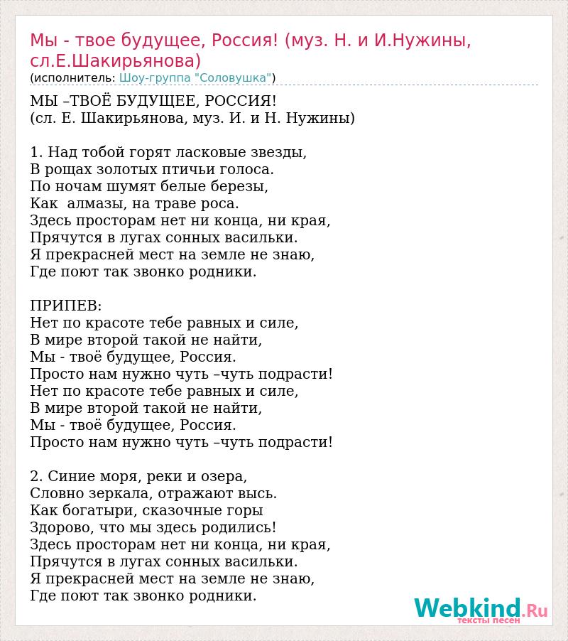 МЫ –ТВОЁ БУДУЩЕЕ, РОССИЯ! (сл. Е. Шакирьянова, муз. И. и Н. Нужины) 1. Над тобой горят ласковые звезды, В рощах золотых птичьи голоса. По ночам шумят белые березы, Как алмазы, на траве роса. Здесь просторам нет ни конца, ни края, Прячутся в лугах сонных васильки. Я прекрасней мест на земле не знаю, Где поют так звонко родники. ПРИПЕВ: Нет по красоте тебе равных и силе, В мире второй такой не найти, Мы - твоё будущее, Россия. Просто нам нужно чуть –чуть подрасти! Нет по красоте тебе равных и силе, В мире второй такой не найти, Мы - твоё будущее, Россия. Просто нам нужно чуть –чуть подрасти! 2. Синие моря, реки и озера, Словно зеркала, отражают высь. Как богатыри, сказочные горы Здорово, что мы здесь родились! Здесь просторам нет ни конца, ни края, Прячутся в лугах сонных васильки. Я прекрасней мест на земле не знаю, Где поют так звонко родники.