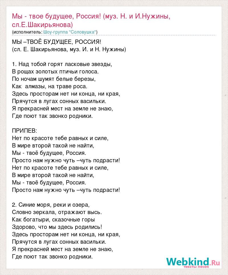 МЫ –ТВОЁ БУДУЩЕЕ, РОССИЯ! (сл. Е. Шакирьянова, муз. И. и Н. Нужины) 1. Над тобой горят ласковые звезды, В рощах золотых птичьи голоса. По ночам шумят белые березы, Как алмазы, на траве роса. Здесь просторам нет ни конца, ни края, Прячутся в лугах сонных васильки. Я прекрасней мест на земле не знаю, Где поют так звонко родники. ПРИПЕВ: Нет по красоте тебе равных и силе, В мире второй такой не найти, Мы - твоё будущее, Россия. Просто нам нужно чуть –чуть подрасти! Нет по красоте тебе равных и силе, В мире второй такой не найти, Мы - твоё будущее, Россия. Просто нам нужно чуть –чуть подрасти! 2. Синие моря, реки и озера, Словно зеркала, отражают высь. Как богатыри, сказочные горы Здорово, что мы здесь родились! Здесь просторам нет ни конца, ни края, Прячутся в лугах сонных васильки. Я прекрасней мест на земле не знаю, Где поют так звонко родники.