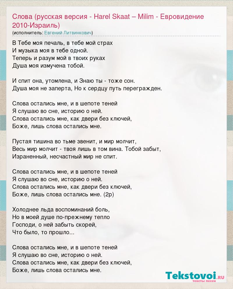 Главная→Исполнители→Евгений Литвинкович→Слова (русская версия - Harel Skaat – Milim - Евровидение 2010-Израиль)