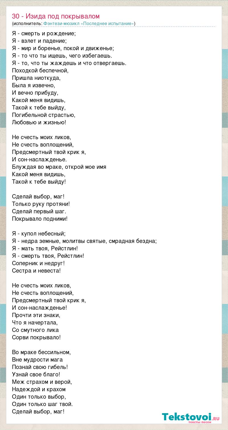 Я - смерть и рождение; Я - взлет и падение; Я - мир и боренье, покой и движенье; Я - то что ты ищешь, чего избегаешь. Я - то, что ты жаждешь и что отвергаешь. Походкой беспечной, Пришла ниоткуда, Была я извечно, И вечно прибуду, Какой меня видишь, Такой к тебе выйду, Погибельной страстью, Любовью и жизнью! Не счесть моих ликов, Не счесть воплощений, Предсмертный твой крик я, И сон-наслажденье. Блуждая во мраке, открой мое имя Какой меня видишь, Такой к тебе выйду! Сделай выбор, маг! Только руку протяни! Сделай первый шаг. Покрывало подними! Я - купол небесный; Я - недра земные, молитвы святые, смрадная бездна; Я - мать твоя, Рейстлин! Я - смерть твоя, Рейстлин! Соперник и недруг! Сестра и невеста! Не счесть моих ликов, Не счесть воплощений, Предсмертный твой крик я, И сон-наслажденье! Прочти эти знаки, Что я начертала, Со смутного лика Сорви покрывало! Во мраке бессильном, Вне мудрости мага Познай свою гибель! Узнай свое благо! Меж страхом и верой, Надеждой и крахом Один только выбор, Один только шаг твой. Сделай выбор, маг!