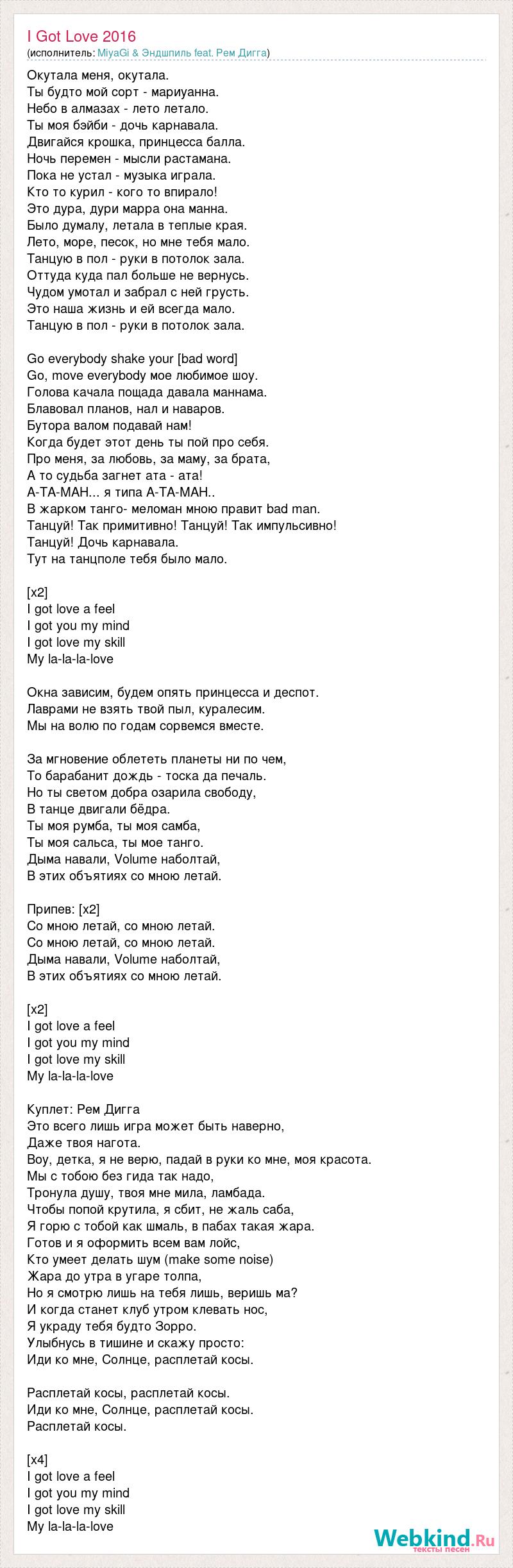 Окутала меня, окутала. Ты будто мой сорт - мариуанна. Небо в алмазах - лето летало. Ты моя бэйби - дочь карнавала. Двигайся крошка, принцесса балла. Ночь перемен - мысли растамана. Пока не устал - музыка играла. Кто то курил - кого то впирало! Это дура, дури марра она манна. Было думалу, летала в теплые края. Лето, море, песок, но мне тебя мало. Танцую в пол - руки в потолок зала. Оттуда куда пал больше не вернусь. Чудом умотал и забрал с ней грусть. Это наша жизнь и ей всегда мало. Танцую в пол - руки в потолок зала. Go everybody shake your [bad word] Go, move everybody мое любимое шоу. Голова качала пощада давала маннама. Блавовал планов, нал и наваров. Бутора валом подавай нам! Когда будет этот день ты пой про себя. Про меня, за любовь, за маму, за брата, А то судьба загнет ата - ата! А-ТА-МАН... я типа А-ТА-МАН.. В жарком танго- меломан мною правит bad man. Танцуй! Так примитивно! Танцуй! Так импульсивно! Танцуй! Дочь карнавала. Тут на танцполе тебя было мало. [x2] I got love a feel I got you my mind I got love my skill My la-la-la-love Окна зависим, будем опять принцесса и деспот. Лаврами не взять твой пыл, куралесим. Мы на волю по годам сорвемся вместе. За мгновение облететь планеты ни по чем, То барабанит дождь - тоска да печаль. Но ты светом добра озарила свободу, В танце двигали бёдра. Ты моя румба, ты моя самба, Ты моя сальса, ты мое танго. Дыма навали, Volume наболтай, В этих объятиях со мною летай. Припев: [х2] Со мною летай, со мною летай. Со мною летай, со мною летай. Дыма навали, Volume наболтай, В этих объятиях со мною летай. [х2] I got love a feel I got you my mind I got love my skill My la-la-la-love Куплет: Рем Дигга Это всего лишь игра может быть наверно, Даже твоя нагота. Воу, детка, я не верю, падай в руки ко мне, моя красота. Мы с тобою без гида так надо, Тронула душу, твоя мне мила, ламбада. Чтобы попой крутила, я сбит, не жаль саба, Я горю с тобой как шмаль, в пабах такая жара. Готов и я оформить всем вам лойс, Кто умеет делать шум (make some noise) Жара до утра в угаре толпа, Но я смотрю лишь на тебя лишь, веришь ма? И когда станет клуб утром клевать нос, Я украду тебя будто Зорро. Улыбнусь в тишине и скажу просто: Иди ко мне, Солнце, расплетай косы. Расплетай косы, расплетай косы. Иди ко мне, Солнце, расплетай косы. Расплетай косы. [x4] I got love a feel I got you my mind I got love my skill My la-la-la-love
