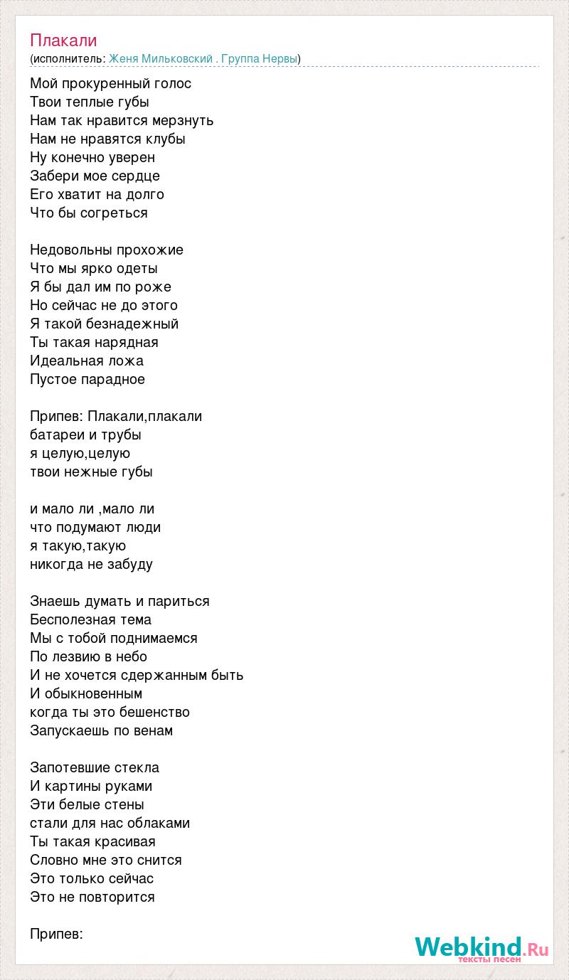 Мой прокуренный голос Твои теплые губы Нам так нравится мерзнуть Нам не нравятся клубы Ну конечно уверен Забери мое сердце Его хватит на долго Что бы согреться Недовольны прохожие Что мы ярко одеты Я бы дал им по роже Но сейчас не до этого Я такой безнадежный Ты такая нарядная Идеальная ложа Пустое парадное Припев: Плакали,плакали батареи и трубы я целую,целую твои нежные губы и мало ли ,мало ли что подумают люди я такую,такую никогда не забуду Знаешь думать и париться Бесполезная тема Мы с тобой поднимаемся По лезвию в небо И не хочется сдержанным быть И обыкновенным когда ты это бешенство Запускаешь по венам Запотевшие стекла И картины руками Эти белые стены стали для нас облаками Ты такая красивая Словно мне это снится Это только сейчас Это не повторится Припев: