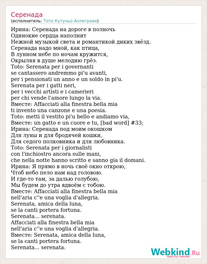 Ирина: Серенада на дороге в полночь Одинокие сердца наполнит Нежной музыкой света и романтикой диких звёзд. Серенада надо мной, как птица, В лунном небе по ночам кружится, Окрыляя в душе мелодию грёз. Toto: Serenata per i governanti se cantassero andremmo pi'u avanti, per i pensionati un anno e un soldo in pi'u. Serenata per i gatti neri, per i vecchi artisti e i camerieri per chi vende l'amore lungo la via. Вместе: Affacciati alla finestra bella mia ti invento una canzone e una poesia. Toto: metti il vestito pi'u bello e andiamo via, Вместе: un gatto e un cuore e tu, [bad word] #33; Ирина: Серенада под моим окошком Для луны и для бродячей кошки, Для седого полковника и для любовника. Toto: Serenata per i giornalisti con l'inchiostro ancora sulle mani, che nella notte hanno scritto e sanno giа il domani. Ирина: Я прямо в ночь своё окно открою, Чтоб небо пело нам над головою. И где-то там, за далью голубою, Мы будем до утра вдвоём с тобою. Вместе: Affacciati alla finestra bella mia nell'aria c''e una voglia d'allegria. Serenata, amica della luna, se la canti porterа fortuna. Serenata... serenata. Affacciati alla finestra bella mia nell'aria c''e una voglia d'allegria. Вместе: Serenata, amica della luna, se la canti porterа fortuna. Serenata... serenata.