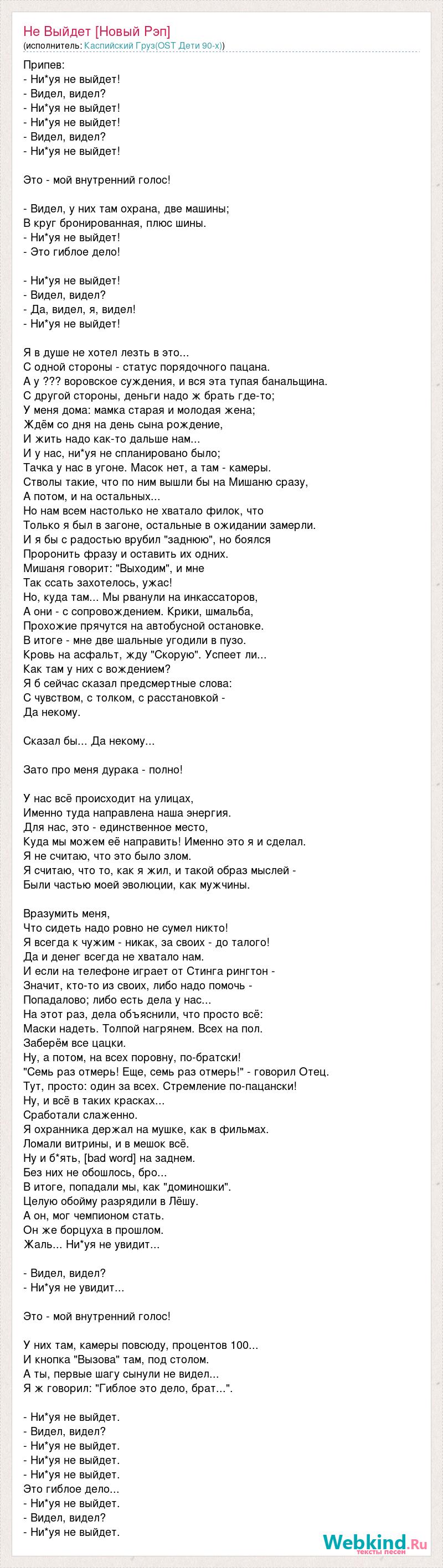Припев: - Ни*уя не выйдет! - Видел, видел? - Ни*уя не выйдет! - Ни*уя не выйдет! - Видел, видел? - Ни*уя не выйдет! Это - мой внутренний голос! - Видел, у них там охрана, две машины; В круг бронированная, плюс шины. - Ни*уя не выйдет! - Это гиблое дело! - Ни*уя не выйдет! - Видел, видел? - Да, видел, я, видел! - Ни*уя не выйдет! Я в душе не хотел лезть в это... С одной стороны - статус порядочного пацана. А у ??? воровское суждения, и вся эта тупая банальщина. С другой стороны, деньги надо ж брать где-то; У меня дома: мамка старая и молодая жена; Ждём со дня на день сына рождение, И жить надо как-то дальше нам... И у нас, ни*уя не спланировано было; Тачка у нас в угоне. Масок нет, а там - камеры. Стволы такие, что по ним вышли бы на Мишаню сразу, А потом, и на остальных... Но нам всем настолько не хватало филок, что Только я был в загоне, остальные в ожидании замерли. И я бы с радостью врубил "заднюю", но боялся Проронить фразу и оставить их одних. Мишаня говорит: "Выходим", и мне Так ссать захотелось, ужас! Но, куда там... Мы рванули на инкассаторов, А они - с сопровождением. Крики, шмальба, Прохожие прячутся на автобусной остановке. В итоге - мне две шальные угодили в пузо. Кровь на асфальт, жду "Скорую". Успеет ли... Как там у них с вождением? Я б сейчас сказал предсмертные слова: С чувством, с толком, с расстановкой - Да некому. Сказал бы... Да некому... Зато про меня дурака - полно! У нас всё происходит на улицах, Именно туда направлена наша энергия. Для нас, это - единственное место, Куда мы можем её направить! Именно это я и сделал. Я не считаю, что это было злом. Я считаю, что то, как я жил, и такой образ мыслей - Были частью моей эволюции, как мужчины. Вразумить меня, Что сидеть надо ровно не сумел никто! Я всегда к чужим - никак, за своих - до талого! Да и денег всегда не хватало нам. И если на телефоне играет от Стинга рингтон - Значит, кто-то из своих, либо надо помочь - Попадалово; либо есть дела у нас... На этот раз, дела объяснили, что просто всё: Маски надеть. Толпой нагрянем. Всех на пол. Заберём все цацки. Ну, а потом, на всех поровну, по-братски! "Семь раз отмерь! Еще, семь раз отмерь!" - говорил Отец. Тут, просто: один за всех. Стремление по-пацански! Ну, и всё в таких красках... Сработали слаженно. Я охранника держал на мушке, как в фильмах. Ломали витрины, и в мешок всё. Ну и б*ять, [bad word] на заднем. Без них не обошлось, бро... В итоге, попадали мы, как "доминошки". Целую обойму разрядили в Лёшу. А он, мог чемпионом стать. Он же борцуха в прошлом. Жаль... Ни*уя не увидит... - Видел, видел? - Ни*уя не увидит... Это - мой внутренний голос! У них там, камеры повсюду, процентов 100... И кнопка "Вызова" там, под столом. А ты, первые шагу сынули не видел... Я ж говорил: "Гиблое это дело, брат...". - Ни*уя не выйдет. - Видел, видел? - Ни*уя не выйдет. - Ни*уя не выйдет. - Ни*уя не выйдет. Это гиблое дело... - Ни*уя не выйдет. - Видел, видел? - Ни*уя не выйдет.