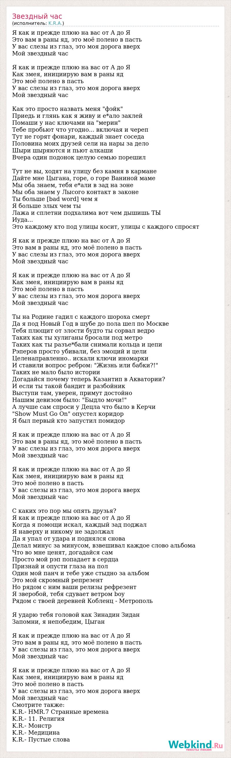 Я как и прежде плюю на вас от А до Я Это вам в раны яд, это моё полено в пасть У вас слезы из глаз, это моя дорога вверх Мой звездный час Я как и прежде плюю на вас от А до Я Как змея, инициирую вам в раны яд Это моё полено в пасть У вас слезы из глаз, это моя дорога вверх Мой звездный час Как это просто назвать меня "фэйк" Приедь и глянь как я живу и е*ало заклей Помаши у нас ключами на "мерин" Тебе пробьют что угодно... включая и череп Тут не горят фонари, каждый знает соседа Половина моих друзей сели на нары за дело Шыри шыряются и пьют алкаши Вчера один подонок целую семью порешил Тут не вы, ходят на улицу без камня в кармане Дайте мне Цыгана, горе, о горе Ваниной маме Мы оба знаем, тебя е*али в зад на зоне Мы оба знаем у Лысого контакт в законе Ты больше [bad word] чем я Я больше злых чем ты Лажа и сплетни подхалима вот чем дышишь ТЫ Иуда... Это каждому кто под улицы косит, улицы с каждого спросят Я как и прежде плюю на вас от А до Я Это вам в раны яд, это моё полено в пасть У вас слезы из глаз, это моя дорога вверх Мой звездный час Я как и прежде плюю на вас от А до Я Как змея, инициирую вам в раны яд Это моё полено в пасть У вас слезы из глаз, это моя дорога вверх Мой звездный час Ты на Родине гадил с каждого шороха смерт Да я под Новый Год в шубе до пола шел по Москве Тебя плющит от злости будто ты сорвал ведро Таких как ты хулиганы бросали под метро Таких как ты разъе*бали снимали кольца и цепи Рэперов просто убивали, без эмоций и цели Целенаправленно.. искали ключи иномарки И ставили вопрос ребром: "Жизнь или бабки?!" Таких не мало было истории Догадайся почему теперь Казантип в Акватории? И если ты такой бандит и разбойник Выступи там, уверен, примут достойно Нашим девизом было: "Быдло мочи!" А лучше сам спроси у Децла что было в Керчи "Show Must Go On" опустел коридор Я был первый кто запустил помидор Я как и прежде плюю на вас от А до Я Это вам в раны яд, это моё полено в пасть У вас слезы из глаз, это моя дорога вверх Мой звездный час Я как и прежде плюю на вас от А до Я Как змея, инициирую вам в раны яд Это моё полено в пасть У вас слезы из глаз, это моя дорога вверх Мой звездный час С каких это пор мы опять друзья? Я как и прежде плюю на вас от А до Я Когда я помощи искал, каждый зад поджал Я наверху и никому не задолжал Да я упал от удара и поднялся снова Делал минус за минусом, взвешивал каждое слово альбома Что во мне ценят, догадайся сам Просто мой рэп попадает в сердца Признай и опусти глаза на пол Один мой панч и тебе уже стыдно за альбом Это мой скромный репрезент Но рядом с ним ваши релизы рефрезент Я зверобой, тебя сдувает ветром boy Рядом с твоей деревней Кобленц - Метрополь Я ударю тебя головой как Зинадин Зидан Запомни, я непобедим, Цыган Я как и прежде плюю на вас от А до Я Это вам в раны яд, это моё полено в пасть У вас слезы из глаз, это моя дорога вверх Мой звездный час Я как и прежде плюю на вас от А до Я Как змея, инициирую вам в раны яд Это моё полено в пасть У вас слезы из глаз, это моя дорога вверх Мой звездный час Смотрите также: K.R.- HMR.7 Странные времена K.R.- 11. Религия K.R.- Монстр K.R.- Медицина K.R.- Пустые слова