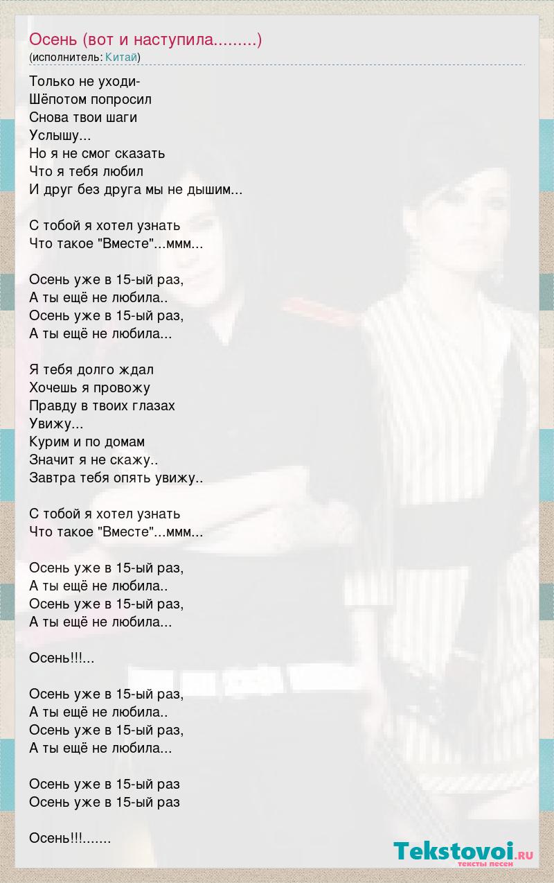 Только не уходи- Шёпотом попросил Снова твои шаги Услышу... Но я не смог сказать Что я тебя любил И друг без друга мы не дышим... С тобой я хотел узнать Что такое "Вместе"...ммм... Осень уже в 15-ый раз, А ты ещё не любила.. Осень уже в 15-ый раз, А ты ещё не любила... Я тебя долго ждал Хочешь я провожу Правду в твоих глазах Увижу... Курим и по домам Значит я не скажу.. Завтра тебя опять увижу.. С тобой я хотел узнать Что такое "Вместе"...ммм... Осень уже в 15-ый раз, А ты ещё не любила.. Осень уже в 15-ый раз, А ты ещё не любила... Осень!!!... Осень уже в 15-ый раз, А ты ещё не любила.. Осень уже в 15-ый раз, А ты ещё не любила... Осень уже в 15-ый раз Осень уже в 15-ый раз Осень!!!.......