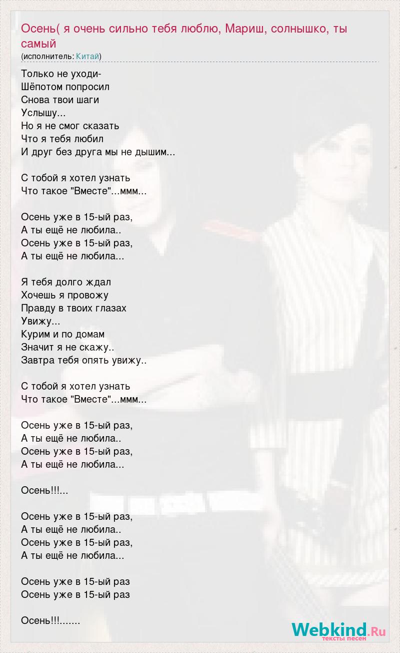 Только не уходи- Шёпотом попросил Снова твои шаги Услышу... Но я не смог сказать Что я тебя любил И друг без друга мы не дышим... С тобой я хотел узнать Что такое "Вместе"...ммм... Осень уже в 15-ый раз, А ты ещё не любила.. Осень уже в 15-ый раз, А ты ещё не любила... Я тебя долго ждал Хочешь я провожу Правду в твоих глазах Увижу... Курим и по домам Значит я не скажу.. Завтра тебя опять увижу.. С тобой я хотел узнать Что такое "Вместе"...ммм... Осень уже в 15-ый раз, А ты ещё не любила.. Осень уже в 15-ый раз, А ты ещё не любила... Осень!!!... Осень уже в 15-ый раз, А ты ещё не любила.. Осень уже в 15-ый раз, А ты ещё не любила... Осень уже в 15-ый раз Осень уже в 15-ый раз Осень!!!.......
