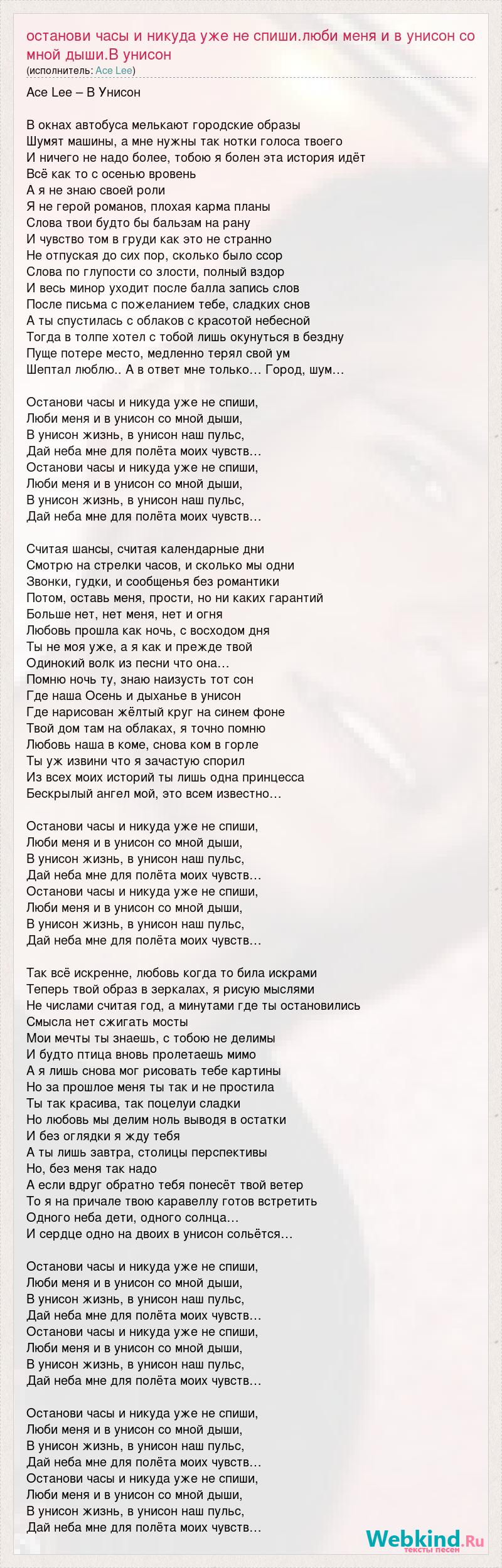 Ace Lee – В Унисон В окнах автобуса мелькают городские образы Шумят машины, а мне нужны так нотки голоса твоего И ничего не надо более, тобою я болен эта история идёт Всё как то с осенью вровень А я не знаю своей роли Я не герой романов, плохая карма планы Слова твои будто бы бальзам на рану И чувство том в груди как это не странно Не отпуская до сих пор, сколько было ссор Слова по глупости со злости, полный вздор И весь минор уходит после балла запись слов После письма с пожеланием тебе, сладких снов А ты спустилась с облаков с красотой небесной Тогда в толпе хотел с тобой лишь окунуться в бездну Пуще потере место, медленно терял свой ум Шептал люблю.. А в ответ мне только… Город, шум… Останови часы и никуда уже не спиши, Люби меня и в унисон со мной дыши, В унисон жизнь, в унисон наш пульс, Дай неба мне для полёта моих чувств… Останови часы и никуда уже не спиши, Люби меня и в унисон со мной дыши, В унисон жизнь, в унисон наш пульс, Дай неба мне для полёта моих чувств… Считая шансы, считая календарные дни Смотрю на стрелки часов, и сколько мы одни Звонки, гудки, и сообщенья без романтики Потом, оставь меня, прости, но ни каких гарантий Больше нет, нет меня, нет и огня Любовь прошла как ночь, с восходом дня Ты не моя уже, а я как и прежде твой Одинокий волк из песни что она… Помню ночь ту, знаю наизусть тот сон Где наша Осень и дыханье в унисон Где нарисован жёлтый круг на синем фоне Твой дом там на облаках, я точно помню Любовь наша в коме, снова ком в горле Ты уж извини что я зачастую спорил Из всех моих историй ты лишь одна принцесса Бескрылый ангел мой, это всем известно… Останови часы и никуда уже не спиши, Люби меня и в унисон со мной дыши, В унисон жизнь, в унисон наш пульс, Дай неба мне для полёта моих чувств… Останови часы и никуда уже не спиши, Люби меня и в унисон со мной дыши, В унисон жизнь, в унисон наш пульс, Дай неба мне для полёта моих чувств… Так всё искренне, любовь когда то била искрами Теперь твой образ в зеркалах, я рисую мыслями Не числами считая год, а минутами где ты остановились Смысла нет сжигать мосты Мои мечты ты знаешь, с тобою не делимы И будто птица вновь пролетаешь мимо А я лишь снова мог рисовать тебе картины Но за прошлое меня ты так и не простила Ты так красива, так поцелуи сладки Но любовь мы делим ноль выводя в остатки И без оглядки я жду тебя А ты лишь завтра, столицы перспективы Но, без меня так надо А если вдруг обратно тебя понесёт твой ветер То я на причале твою каравеллу готов встретить Одного неба дети, одного солнца… И сердце одно на двоих в унисон сольётся… Останови часы и никуда уже не спиши, Люби меня и в унисон со мной дыши, В унисон жизнь, в унисон наш пульс, Дай неба мне для полёта моих чувств… Останови часы и никуда уже не спиши, Люби меня и в унисон со мной дыши, В унисон жизнь, в унисон наш пульс, Дай неба мне для полёта моих чувств… Останови часы и никуда уже не спиши, Люби меня и в унисон со мной дыши, В унисон жизнь, в унисон наш пульс, Дай неба мне для полёта моих чувств… Останови часы и никуда уже не спиши, Люби меня и в унисон со мной дыши, В унисон жизнь, в унисон наш пульс, Дай неба мне для полёта моих чувств…