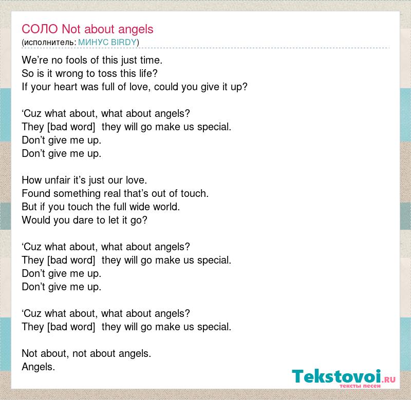 We’re no fools of this just time. So is it wrong to toss this life? If your heart was full of love, could you give it up? ‘Cuz what about, what about angels? They [bad word] they will go make us special. Don’t give me up. Don’t give me up. How unfair it’s just our love. Found something real that’s out of touch. But if you touch the full wide world. Would you dare to let it go? ‘Cuz what about, what about angels? They [bad word] they will go make us special. Don’t give me up. Don’t give me up. ‘Cuz what about, what about angels? They [bad word] they will go make us special. Not about, not about angels. Angels.