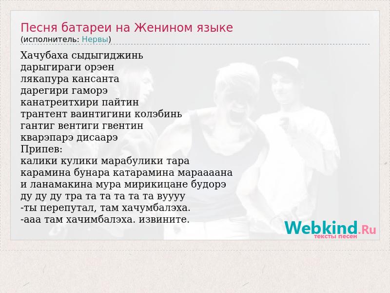 Хачубаха сыдыгиджинь дарыгираги орэен лякапура кансанта дарегири гаморэ канатреитхири пайтин трантент ваинтигини колэбинь гантиг вентиги гвентин кварэпарэ дисаарэ Припев: калики кулики марабулики тара карамина бунара катарамина мараааана и ланамакина мура мирикицане будорэ ду ду ду тра та та та та та вуууу -ты перепутал, там хачумбалэха. -ааа там хачимбалэха. извините.