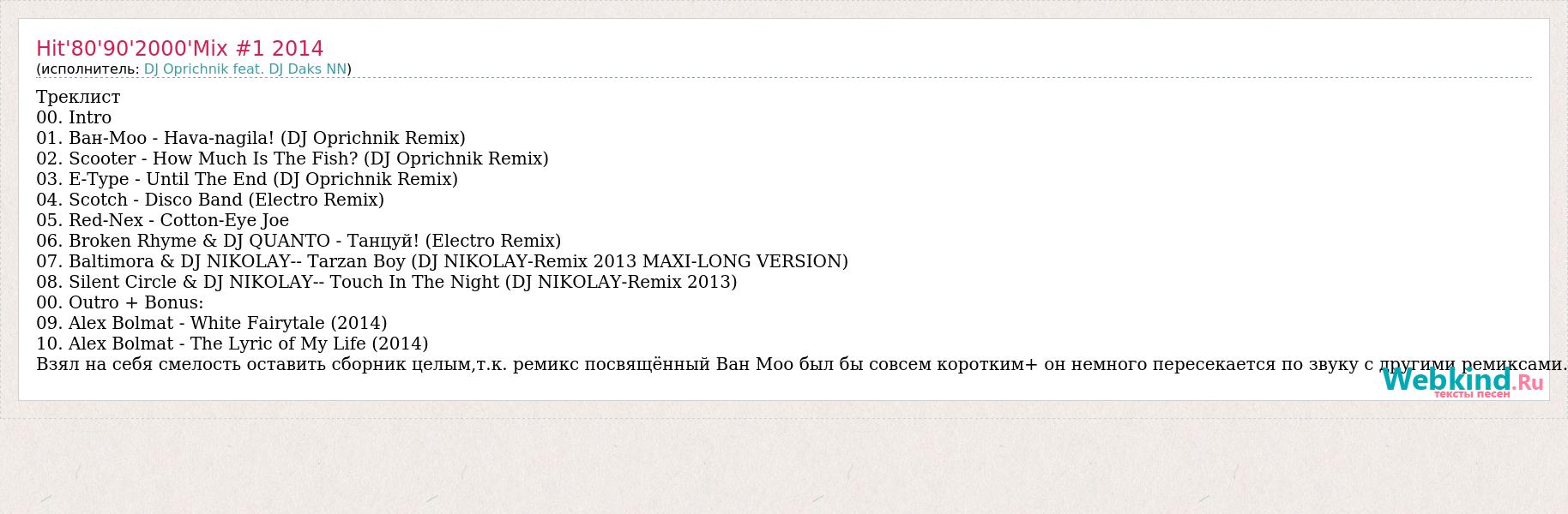 Треклист 00. Intro 01. Ван-Моо - Hava-nagila! (DJ Oprichnik Remix) 02. Scooter - How Much Is The Fish? (DJ Oprichnik Remix) 03. E-Type - Until The End (DJ Oprichnik Remix) 04. Scotch - Disco Band (Electro Remix) 05. Red-Nex - Cotton-Eye Joe 06. Broken Rhyme & DJ QUANTO - Танцуй! (Electro Remix) 07. Baltimora & DJ NIKOLAY-- Tarzan Boy (DJ NIKOLAY-Remix 2013 MAXI-LONG VERSION) 08. Silent Circle & DJ NIKOLAY-- Touch In The Night (DJ NIKOLAY-Remix 2013) 00. Outro + Bonus: 09. Alex Bolmat - White Fairytale (2014) 10. Alex Bolmat - The Lyric of My Life (2014) Взял на себя смелость оставить сборник целым,т.к. ремикс посвящённый Ван Моо был бы совсем коротким+ он немного пересекается по звуку с другими ремиксами.