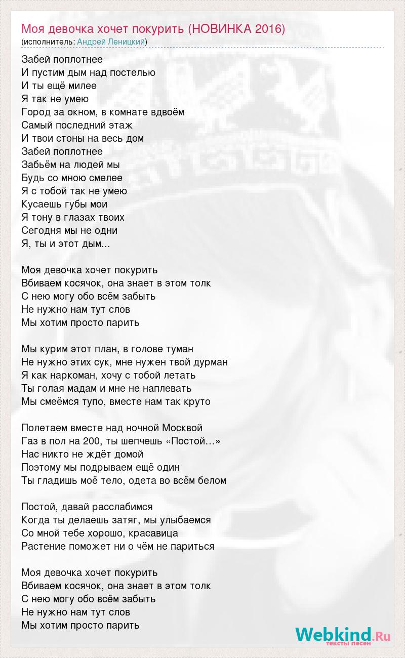 Забей поплотнее И пустим дым над постелью И ты ещё милее Я так не умею Город за окном, в комнате вдвоём Самый последний этаж И твои стоны на весь дом Забей поплотнее Забьём на людей мы Будь со мною смелее Я с тобой так не умею Кусаешь губы мои Я тону в глазах твоих Сегодня мы не одни Я, ты и этот дым... Моя девочка хочет покурить Вбиваем косячок, она знает в этом толк С нею могу обо всём забыть Не нужно нам тут слов Мы хотим просто парить Мы курим этот план, в голове туман Не нужно этих сук, мне нужен твой дурман Я как наркоман, хочу с тобой летать Ты голая мадам и мне не наплевать Мы смеёмся тупо, вместе нам так круто Полетаем вместе над ночной Москвой Газ в пол на 200, ты шепчешь «Постой…» Нас никто не ждёт домой Поэтому мы подрываем ещё один Ты гладишь моё тело, одета во всём белом Постой, давай расслабимся Когда ты делаешь затяг, мы улыбаемся Со мной тебе хорошо, красавица Растение поможет ни о чём не париться Моя девочка хочет покурить Вбиваем косячок, она знает в этом толк С нею могу обо всём забыть Не нужно нам тут слов Мы хотим просто парить