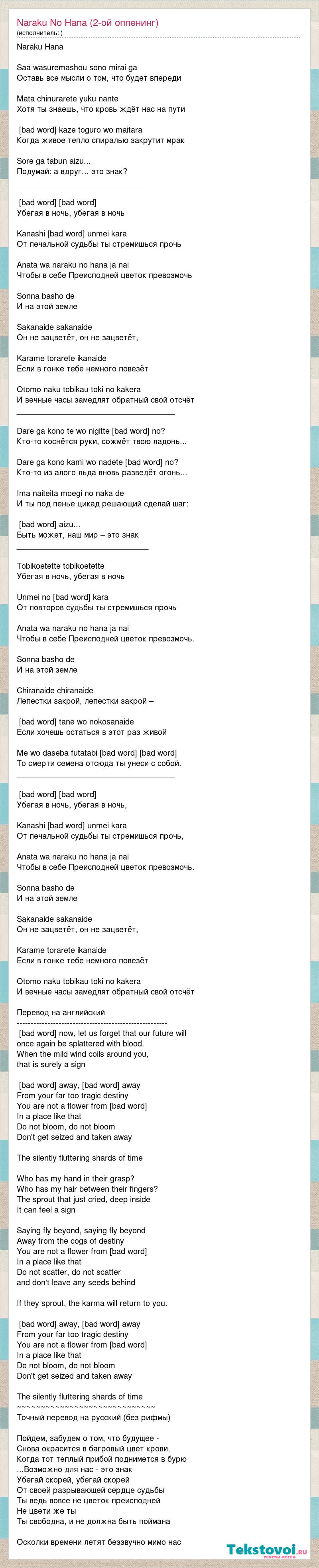 Naraku Hana Saa wasuremashou sono mirai ga Оставь все мысли о том, что будет впереди Mata chinurarete yuku nante Хотя ты знаешь, что кровь ждёт нас на пути [bad word] kaze toguro wo maitara Когда живое тепло спиралью закрутит мрак Sore ga tabun aizu... Подумай: а вдруг... это знак? ____________________________ [bad word] nukedashitette Убегая в ночь, убегая в ночь Kanashi [bad word] unmei kara От печальной судьбы ты стремишься прочь Anata wa naraku no hana ja nai Чтобы в себе Преисподней цветок превозмочь Sonna basho de И на этой земле Sakanaide sakanaide Он не зацветёт, он не зацветёт, Karame torarete ikanaide Если в гонке тебе немного повезёт Otomo naku tobikau toki no kakera И вечные часы замедлят обратный свой отсчёт ____________________________________ Dare ga kono te wo nigitte [bad word] no? Кто-то коснётся руки, сожмёт твою ладонь... Dare ga kono kami wo nadete [bad word] no? Кто-то из алого льда вновь разведёт огонь... Ima naiteita moegi no naka de И ты под пенье цикад решающий сделай шаг: [bad word] aizu... Быть может, наш мир – это знак ______________________________ Tobikoetette tobikoetette Убегая в ночь, убегая в ночь Unmei no [bad word] kara От повторов судьбы ты стремишься прочь Anata wa naraku no hana ja nai Чтобы в себе Преисподней цветок превозмочь. Sonna basho de И на этой земле Chiranaide chiranaide Лепестки закрой, лепестки закрой – [bad word] tane wo nokosanaide Если хочешь остаться в этот раз живой Me wo daseba futatabi [bad word] KARUMA То смерти семена отсюда ты унеси с собой. ____________________________________ [bad word] nukedashitette Убегая в ночь, убегая в ночь, Kanashi [bad word] unmei kara От печальной судьбы ты стремишься прочь, Anata wa naraku no hana ja nai Чтобы в себе Преисподней цветок превозмочь. Sonna basho de И на этой земле Sakanaide sakanaide Он не зацветёт, он не зацветёт, Karame torarete ikanaide Если в гонке тебе немного повезёт Otomo naku tobikau toki no kakera И вечные часы замедлят обратный свой отсчёт Перевод на английский ------------------------------------------------------ [bad word] now, let us forget that our future will once again be splattered with blood. When the mild wind coils around you, that is surely a sign [bad word] away, [bad word] away From your far too tragic destiny You are not a flower from [bad word] In a place like that Do not bloom, do not bloom Don't get seized and taken away The silently fluttering shards of time Who has my hand in their grasp? Who has my hair between their fingers? The sprout that just cried, deep inside It can feel a sign Saying fly beyond, saying fly beyond Away from the cogs of destiny You are not a flower from [bad word] In a place like that Do not scatter, do not scatter and don't leave any seeds behind If they sprout, the karma will return to you. [bad word] away, [bad word] away From your far too tragic destiny You are not a flower from [bad word] In a place like that Do not bloom, do not bloom Don't get seized and taken away The silently fluttering shards of time ~~~~~~~~~~~~~~~~~~~~~~~~~~~~~ Точный перевод на русский (без рифмы) Пойдем, забудем о том, что будущее - Снова окрасится в багровый цвет крови. Когда тот теплый прибой поднимется в бурю ...Возможно для нас - это знак Убегай скорей, убегай скорей От своей разрывающей сердце судьбы Ты ведь вовсе не цветок преисподней Не цвети же ты Ты свободна, и не должна быть поймана Осколки времени летят беззвучно мимо нас