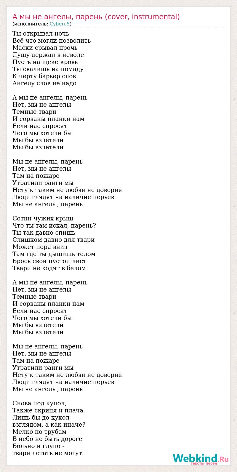Ты открывал ночь Всё что могли позволить Маски срывал прочь Душу держал в неволе Пусть на щеке кровь Ты свалишь на помаду К черту барьер слов Ангелу слов не надо А мы не ангелы, парень Нет, мы не ангелы Темные твари И сорваны планки нам Если нас спросят Чего мы хотели бы Мы бы взлетели Мы бы взлетели Мы не ангелы, парень Нет, мы не ангелы Там на пожаре Утратили ранги мы Нету к таким не любви не доверия Люди глядят на наличие перьев Мы не ангелы, парень Сотни чужих крыш Что ты там искал, парень? Ты так давно спишь Слишком давно для твари Может пора вниз Там где ты дышишь телом Брось свой пустой лист Твари не ходят в белом А мы не ангелы, парень Нет, мы не ангелы Темные твари И сорваны планки нам Если нас спросят Чего мы хотели бы Мы бы взлетели Мы бы взлетели Мы не ангелы, парень Нет, мы не ангелы Там на пожаре Утратили ранги мы Нету к таким не любви не доверия Люди глядят на наличие перьев Мы не ангелы, парень Снова под купол, Также скрипя и плача. Лишь бы до кукол взглядом, а как иначе? Мелко по трубам В небо не быть дороге Больно и глупо - твари летать не могут.