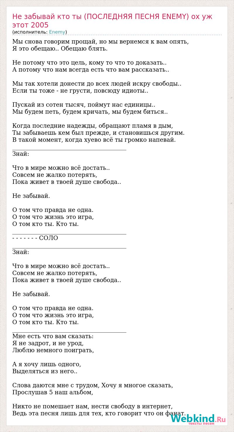 Мы снова говорим прощай, но мы вернемся к вам опять, Я это обещаю.. Обещаю блять. Не потому что это цель, кому то что то доказать.. А потому что нам всегда есть что вам рассказать.. Мы так хотели донести до всех людей искру свободы.. Если ты тоже - не грусти, повсюду идиоты.. Пускай из сотен тысяч, поймут нас единицы.. Мы будем петь, будем кричать, мы будем биться.. Когда последние надежды, обращают пламя в дым, Ты забываешь кем был прежде, и становишься другим. В такой момент, когда хуево всё ты громко напевай. _______________________________________ Знай: Что в мире можно всё достать.. Совсем не жалко потерять, Пока живет в твоей душе свобода.. Не забывай. О том что правда не одна. О том что жизнь это игра, О том кто ты. Кто ты. _______________________________________ - - - - - - - СОЛО _______________________________________ Знай: Что в мире можно всё достать.. Совсем не жалко потерять, Пока живет в твоей душе свобода.. Не забывай. О том что правда не одна. О том что жизнь это игра, О том кто ты. Кто ты. _______________________________________ Мне есть что вам сказать: Я не задрот, и не урод, Люблю немного поиграть, А я хочу лишь одного, Выделяться из него.. Слова даются мне с трудом, Хочу я многое сказать, Прослушав 5 наш альбом, Никто не помешает нам, нести свободу в интернет, Ведь эта песня лишь для тех, кто говорит что он фанат.