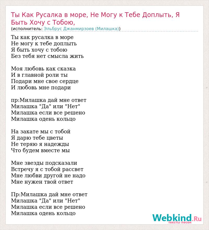 Ты как русалка в море Не могу к тебе доплыть Я быть хочу с тобою Без тебя нет смысла жить Моя любовь как сказка И в главной роли ты Подари мне свое сердце И любовь мне подари пр:Милашка дай мне ответ Милашка "Да" или "Нет" Милашка если все решено Милашка одень кольцо На закате мы с тобой Я дарю тебе цветы Не теряю я надежды Что будем вместе мы Мне звезды подсказали Встречу я с тобой рассвет Мне любви другой не надо Мне нужен твой ответ Пр:Милашка дай мне ответ Милашка "Да" или "Нет" Милашка если все решено Милашка одень кольцо