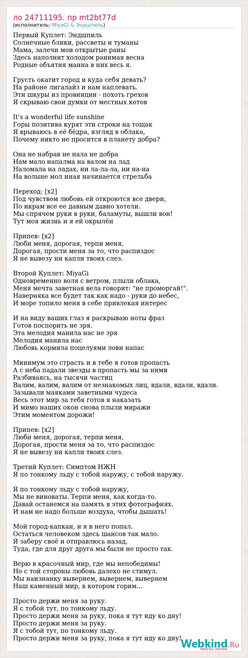 Первый Куплет: Эндшпиль Солнечные блики, рассветы и туманы Мама, залечи мои открытые раны Здесь наполнит холодом ранимая весна Родные объятия манна в них весь я. Грусть окатит город и куда себя девать? На районе лигалайз и нам наплевать. Эти шкуры из провинции - похоть грехов Я скрываю свои думки от местных котов It’s a wonderful life sunshine Горы позитива курят эти строки на тощак Я врываюсь в её бёдра, взгляд в облака, Почему никто не просится в планету добра? Она не набрав не нала не добра Нам мало напалма на валом на лад Наломала на ладах, ни ла-ла-ла, ни на-на На волыне мол иная начинается стрельба Переход: [х2] Под чувством любовь ей откроются все двери, По икрам все ее давным давно хотели. Мы спрячем руки в руки, баламуты, вышли вон! Тут моя жизнь и я ей окрылён Припев: [х2] Люби меня, дорогая, терпи меня, Дорогая, прости меня за то, что распиздос Я не вывезу ни капли твоих слез. Второй Куплет: MiyaGi Одновременно воля с ветром, плыли облака, Меня мечта заветная вела говорит: "не проморгай!". Наверняка все будет так как надо - руки до небес, И море топило меня в себе привлекая интерес И на виду ваших глаз я раскрываю ноты фраз Готов поспорить не зря. Эта мелодия манила нас не зря Мелодия манила нас Любовь кормила поцелуями лови напас Минимум это страсть и в тебе я готов пропасть А с неба падали звезды в пропасть мы за ними Разбиваясь, на тысячи частиц Валим, валим, валим от незнакомых лиц, вдали, вдали, вдали. Зазывали маяками заветными чудеса Весь этот мир за тебя готов я наказать И мимо наших окон снова плыли миражи Этим моментом дорожи! Припев: [х2] Люби меня, дорогая, терпи меня, Дорогая, прости меня за то, что распиздос Я не вывезу ни капли твоих слез. Третий Куплет: Симптом НЖН Я по тонкому льду с тобой наружу, с тобой наружу. Я по тонкому льду с тобой наружу, Мы не виноваты. Терпи меня, как когда-то. Давай останемся на память в этих фотографиях. И нам не надо больше воздуха, чтобы дышать! Мой город-капкан, и я в него попал. Остаться человеком здесь шансов так мало. Я заберу своё и отправлюсь назад, Туда, где для друг друга мы были не просто так. Верю в красочный мир, где мы непобедимы! Но с той стороны любовь далеко не стимул. Мы наизнанку вывернем, вывернем, вывернем Наш каменный мир, в котором горим... Просто держи меня за руку. Я с тобой тут, по тонкому льду. Просто держи меня за руку, пока я тут иду ко дну! Просто держи меня за руку. Я с тобой тут, по тонкому льду. Просто держи меня за руку, пока я тут иду ко дну!