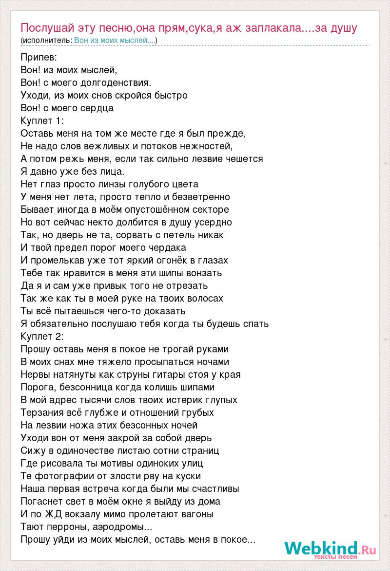 Припев: Вон! из моих мыслей, Вон! с моего долгоденствия. Уходи, из моих снов скройся быстро Вон! с моего сердца Куплет 1: Оставь меня на том же месте где я был прежде, Не надо слов вежливых и потоков нежностей, А потом режь меня, если так сильно лезвие чешется Я давно уже без лица. Нет глаз просто линзы голубого цвета У меня нет лета, просто тепло и безветренно Бывает иногда в моём опустошённом секторе Но вот сейчас некто долбится в душу усердно Так, но дверь не та, сорвать с петель никак И твой предел порог моего чердака И промелькав уже тот яркий огонёк в глазах Тебе так нравится в меня эти шипы вонзать Да я и сам уже привык того не отрезать Так же как ты в моей руке на твоих волосах Ты всё пытаешься чего-то доказать Я обязательно послушаю тебя когда ты будешь спать Куплет 2: Прошу оставь меня в покое не трогай руками В моих снах мне тяжело просыпаться ночами Нервы натянуты как струны гитары стоя у края Порога, безсонница когда колишь шипами В мой адрес тысячи слов твоих истерик глупых Терзания всё глубже и отношений грубых На лезвии ножа этих безсонных ночей Уходи вон от меня закрой за собой дверь Сижу в одиночестве листаю сотни страниц Где рисовала ты мотивы одиноких улиц Те фотографии от злости рву на куски Наша первая встреча когда были мы счастливы Погаснет свет в моём окне я выйду из дома И по ЖД вокзалу мимо пролетают вагоны Тают перроны, аэродромы... Прошу уйди из моих мыслей, оставь меня в покое...