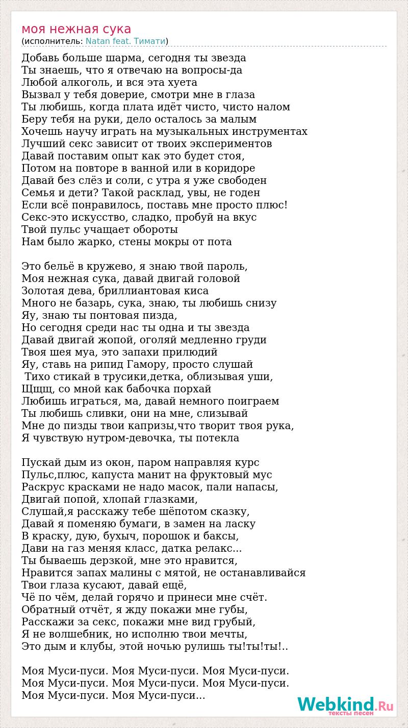 Добавь больше шарма, сегодня ты звезда Ты знаешь, что я отвечаю на вопросы-да Любой алкоголь, и вся эта хуета Вызвал у тебя доверие, смотри мне в глаза Ты любишь, когда плата идёт чисто, чисто налом Беру тебя на руки, дело осталось за малым Хочешь научу играть на музыкальных инструментах Лучший секс зависит от твоих экспериментов Давай поставим опыт как это будет стоя, Потом на повторе в ванной или в коридоре Давай без слёз и соли, с утра я уже свободен Семья и дети? Такой расклад, увы, не годен Если всё понравилось, поставь мне просто плюс! Секс-это искусство, сладко, пробуй на вкус Твой пульс учащает обороты Нам было жарко, стены мокры от пота Это бельё в кружево, я знаю твой пароль, Моя нежная сука, давай двигай головой Золотая дева, бриллиантовая киса Много не базарь, сука, знаю, ты любишь снизу Яу, знаю ты понтовая пизда, Но сегодня среди нас ты одна и ты звезда Давай двигай жопой, оголяй медленно груди Твоя шея муа, это запахи прилюдий Яу, ставь на рипид Гамору, просто слушай Тихо стикай в трусики,детка, облизывая уши, Щщщ, со мной как бабочка порхай Любишь играться, ма, давай немного поиграем Ты любишь сливки, они на мне, слизывай Мне до пизды твои капризы,что творит твоя рука, Я чувствую нутром-девочка, ты потекла Пускай дым из окон, паром направляя курс Пульс,плюс, капуста манит на фруктовый мус Раскрус красками не надо масок, пали напасы, Двигай попой, хлопай глазками, Слушай,я расскажу тебе шёпотом сказку, Давай я поменяю бумаги, в замен на ласку В краску, дую, бухыч, порошок и баксы, Дави на газ меняя класс, датка релакс... Ты бываешь дерзкой, мне это нравится, Нравится запах малины с мятой, не останавливайся Твои глаза кусают, давай ещё, Чё по чём, делай горячо и принеси мне счёт. Обратный отчёт, я жду покажи мне губы, Расскажи за секс, покажи мне вид грубый, Я не волшебник, но исполню твои мечты, Это дым и клубы, этой ночью рулишь ты!ты!ты!.. Моя Муси-пуси. Моя Муси-пуси. Моя Муси-пуси. Моя Муси-пуси. Моя Муси-пуси. Моя Муси-пуси. Моя Муси-пуси. Моя Муси-пуси...
